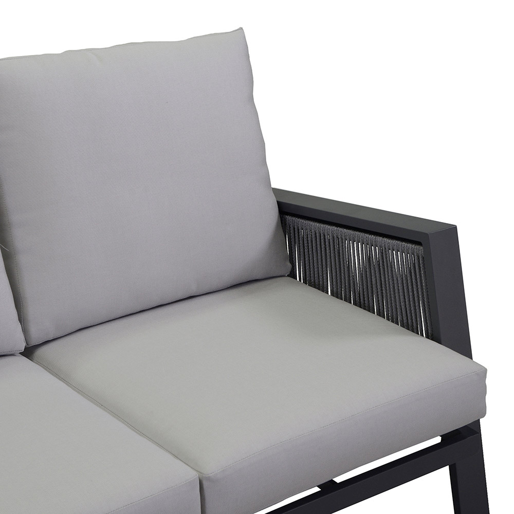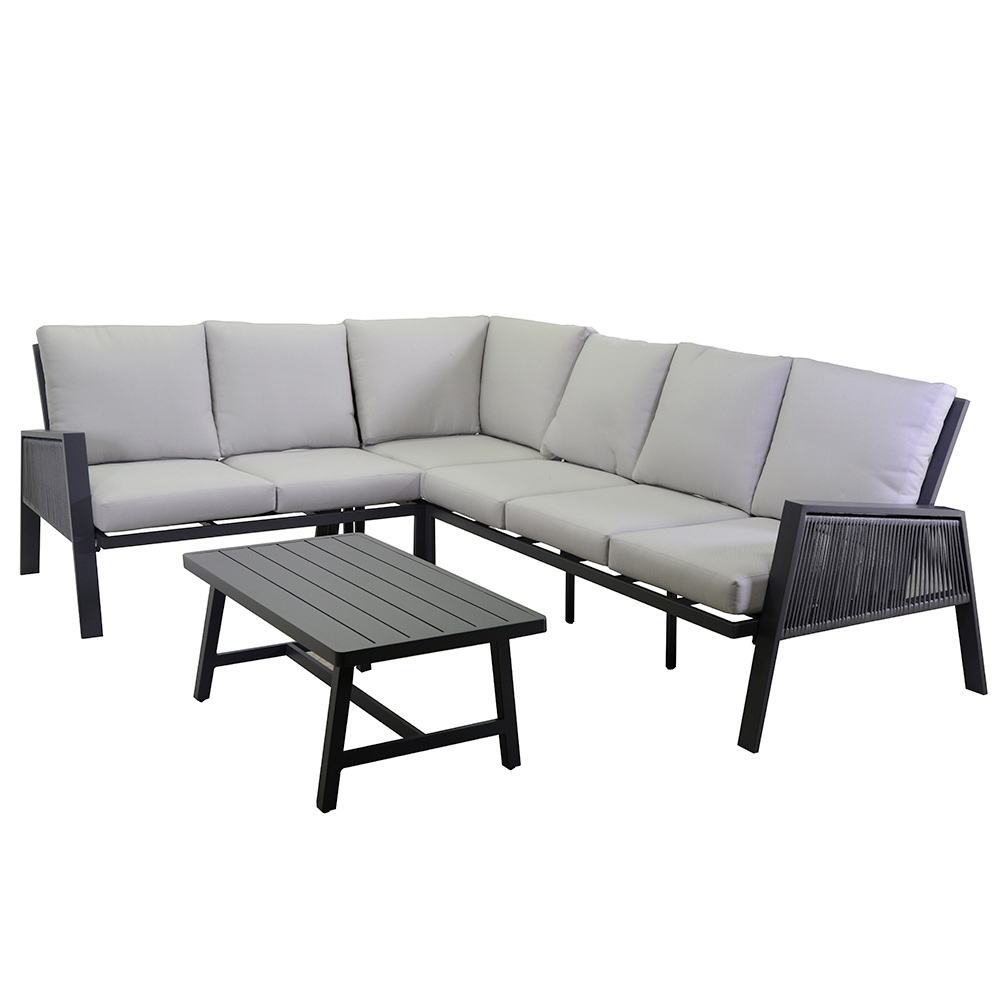 Les coussins 100% oléfine gris clair, déperlants, déhoussables et faciles à entretenir, garantissent un maximum de confort pour de longues périodes de détente en plein air. Complété par une table avec plateau en aluminium , ce salon n'est pas seulement pratique mais aussi esthétique, en combinant la fonctionnalité et le style dans une seule solution de mobilier d'extérieur.