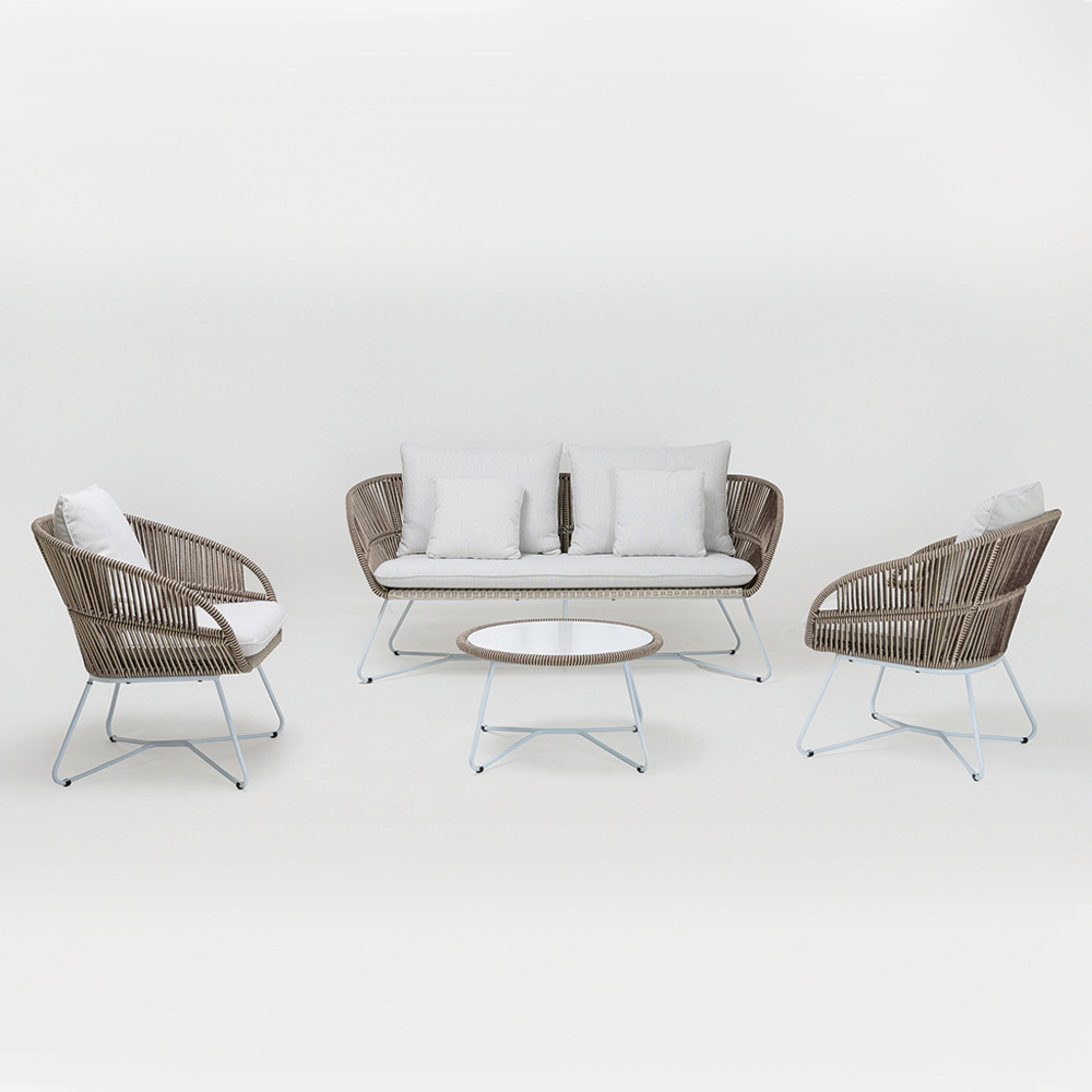 La structure rope ajoute une touche de résistance et de durabilité contre les éléments, en conservant sa beauté au fil du temps. Le design est rehaussé par des détails en aluminium, qui lui donnent un air frais et moderne, ce qui lui permet de se démarquer dans les jardins, sur les terrasses ou au bord de la piscine. La table basse assortie, avec son plateau en verre, est le complément idéal pour accueillir des boissons et des snacks, ce qui en fait l'ensemble parfait pour vos invités et pour vos soirées en plein air.
