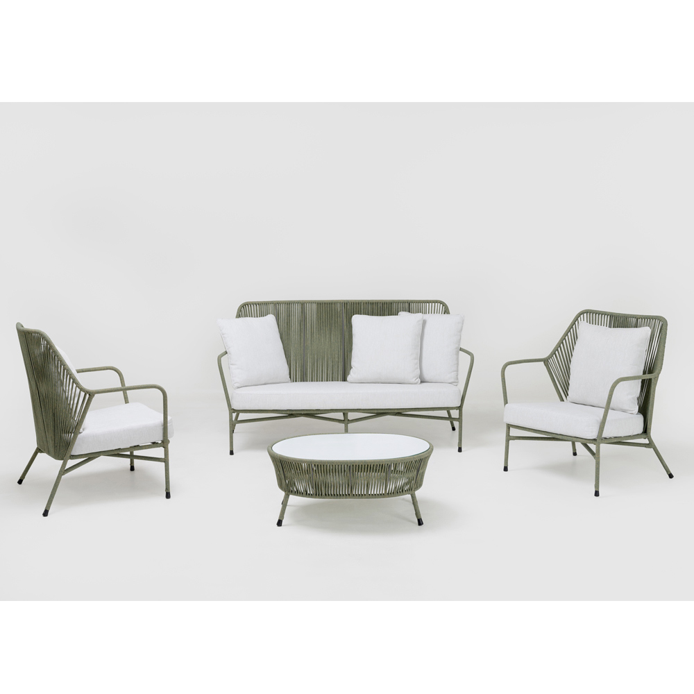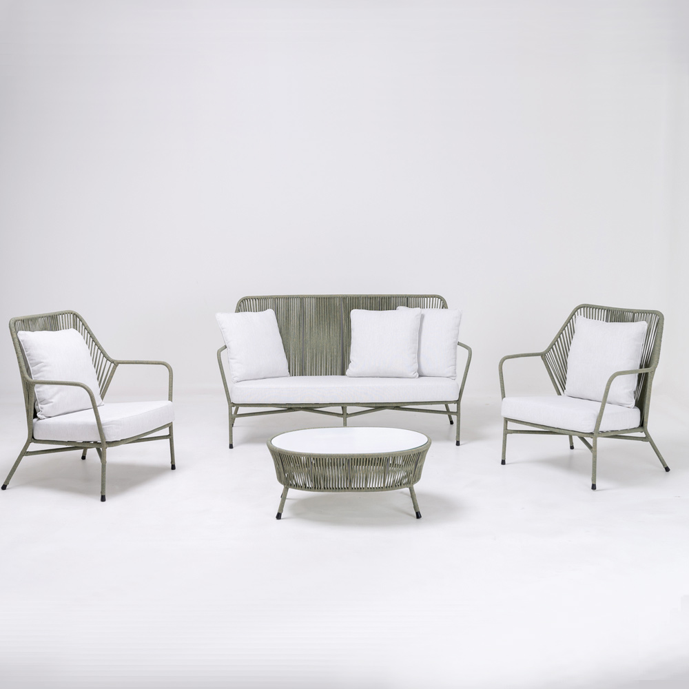Salon de jardin en aluminium, tressage ROPE+, verre et coussins