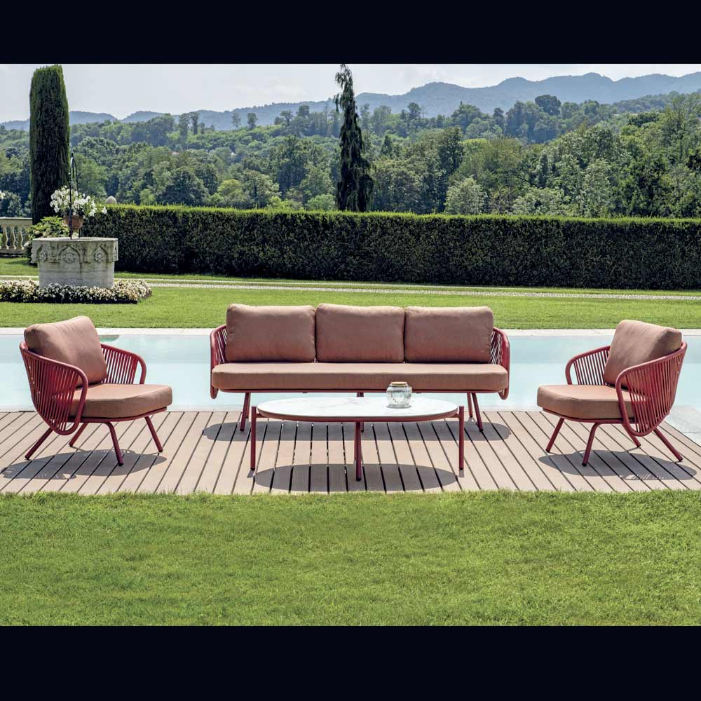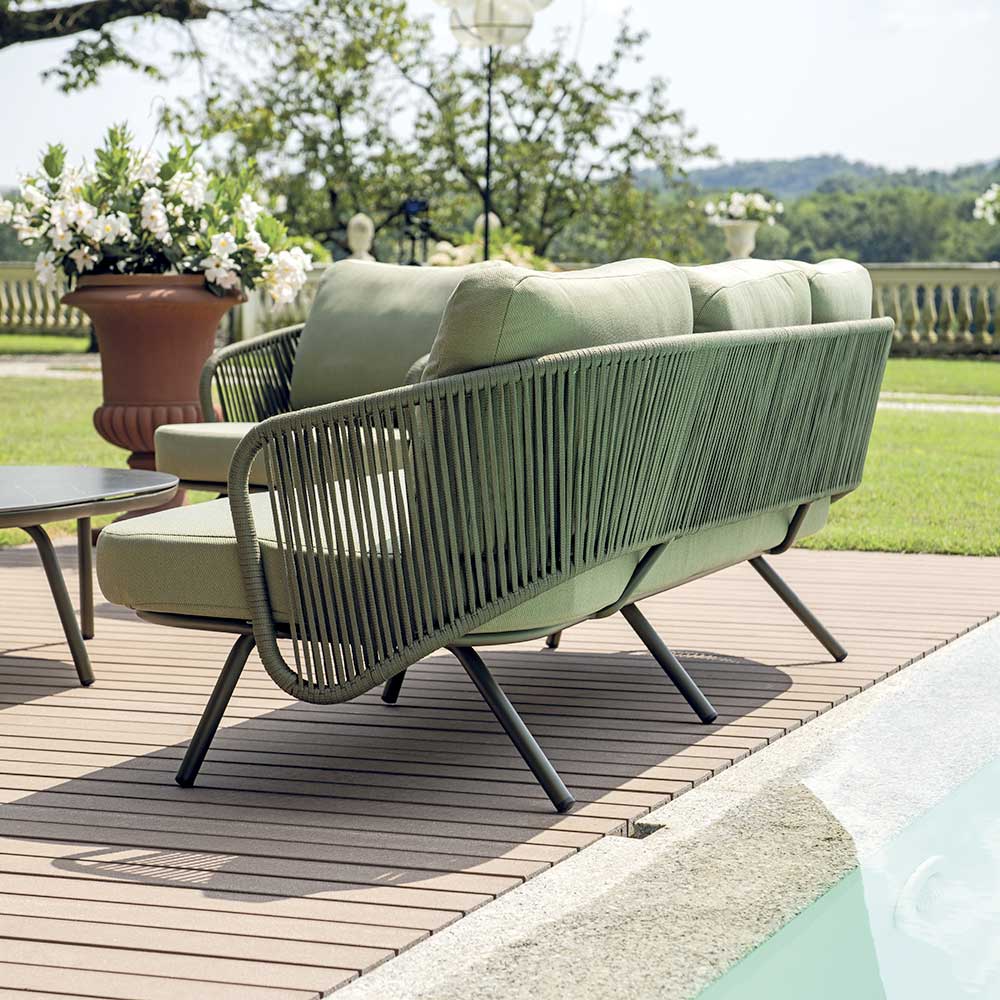 1 canapé : structure en aluminium, dossiers en corde, coussins en tissu déhoussable.