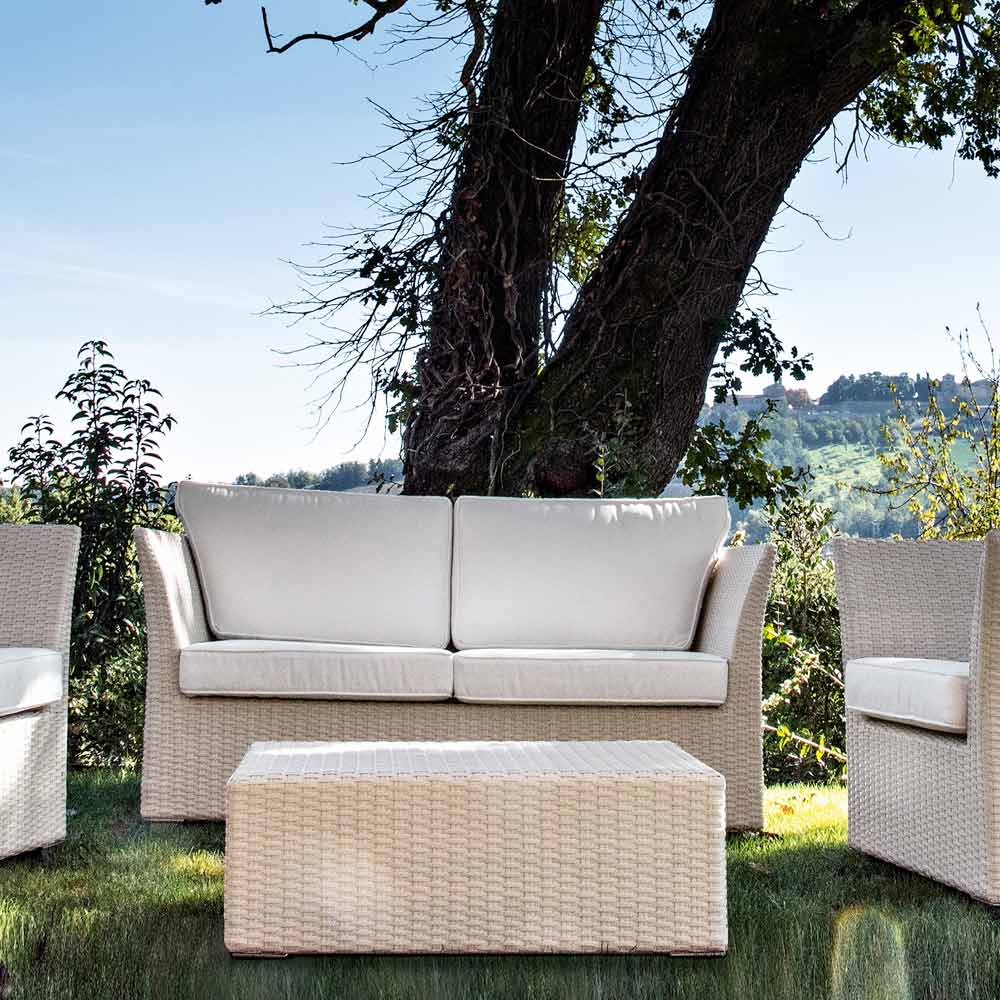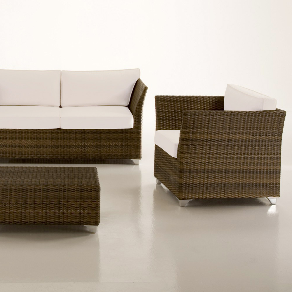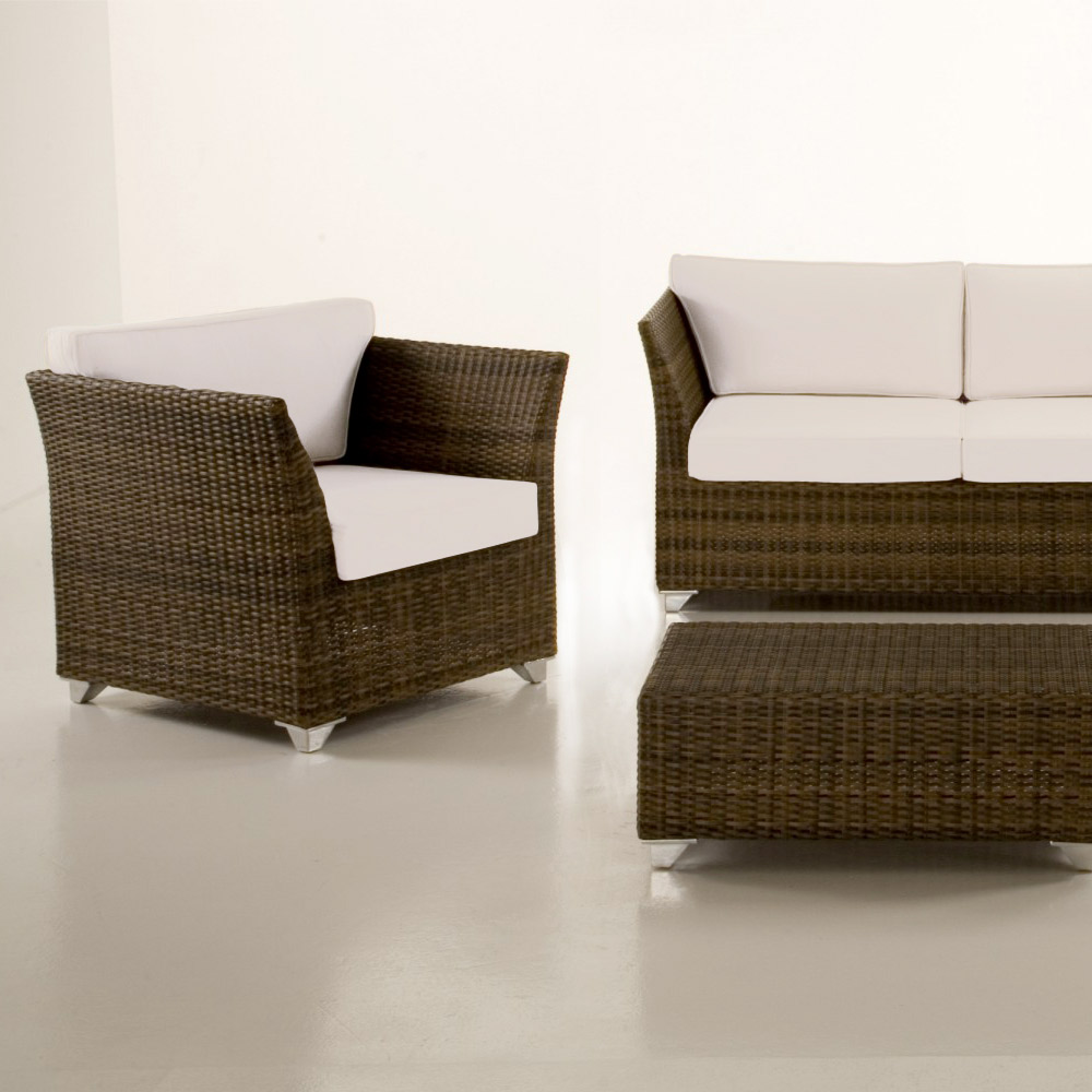 Salon de jardin en aluminium, tissage et coussins en polyrotin de marque REHAU
