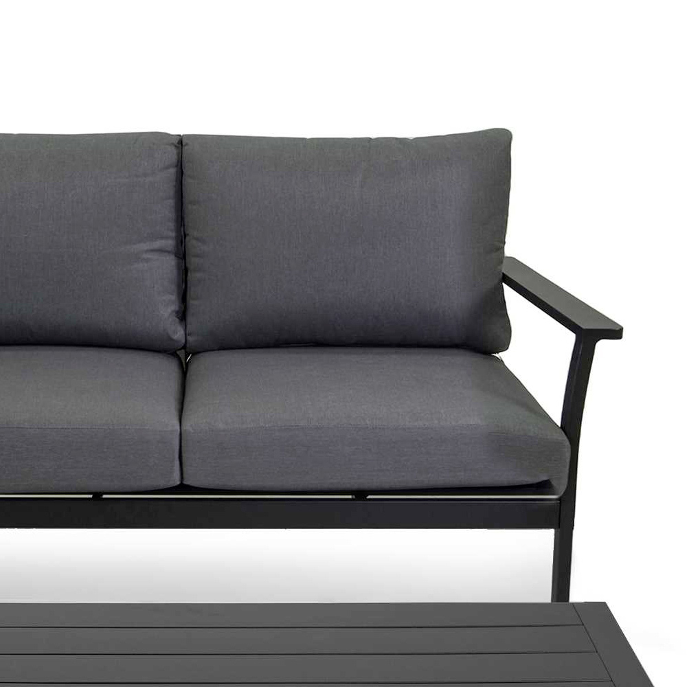 L'ensemble comprend un canapé à deux places, deux fauteuils et une table basse, parfaits pour créer un espace de conversation confortable. Les coussins épais offrent un confort supérieur, invitant à de longs après-midi de détente ou à des soirées douillettes à l'extérieur.