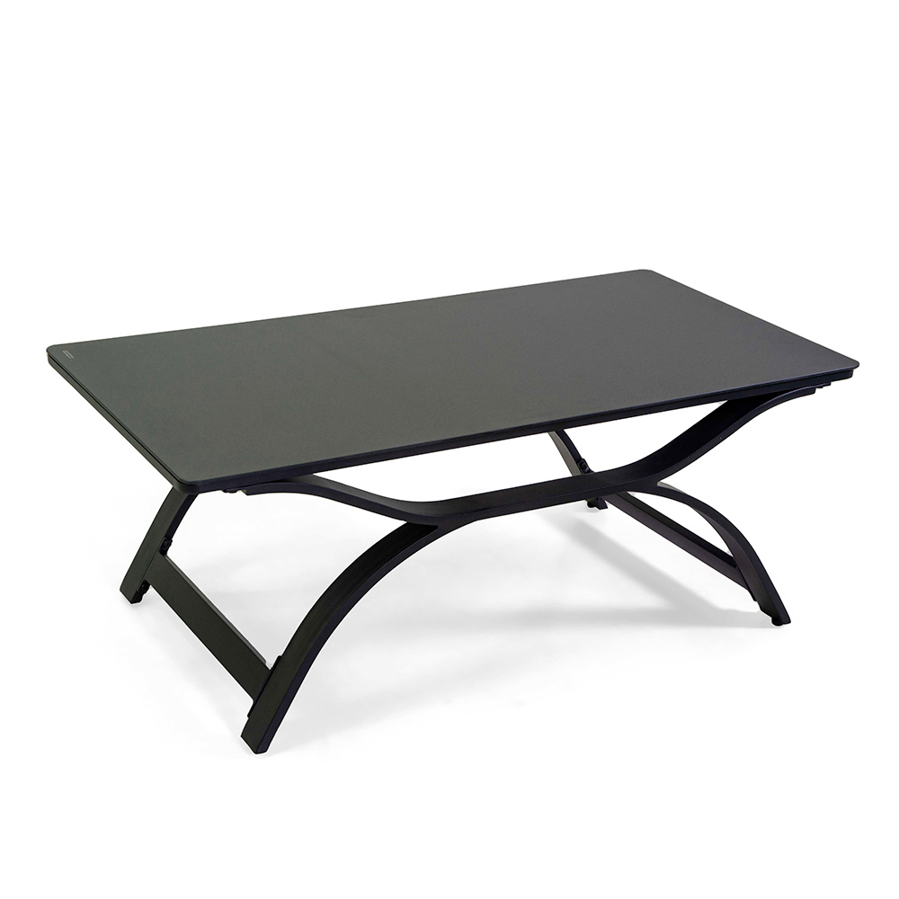 1 table basse : châssis en aluminium antirouille, peint par poudrage en anthracite et plateau en verre trempé peint par poudrage.