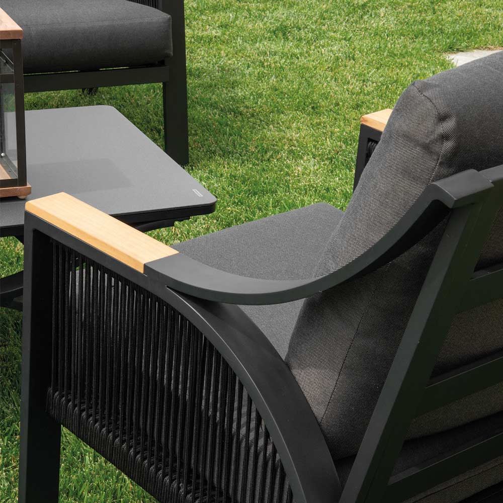 1 canapé : structure en aluminium thermolaqué antirouille gris, cordes en polyester tissé anthracite, coussins déperlants en polyester gris et accoudoirs en bois TEAK du Brésil