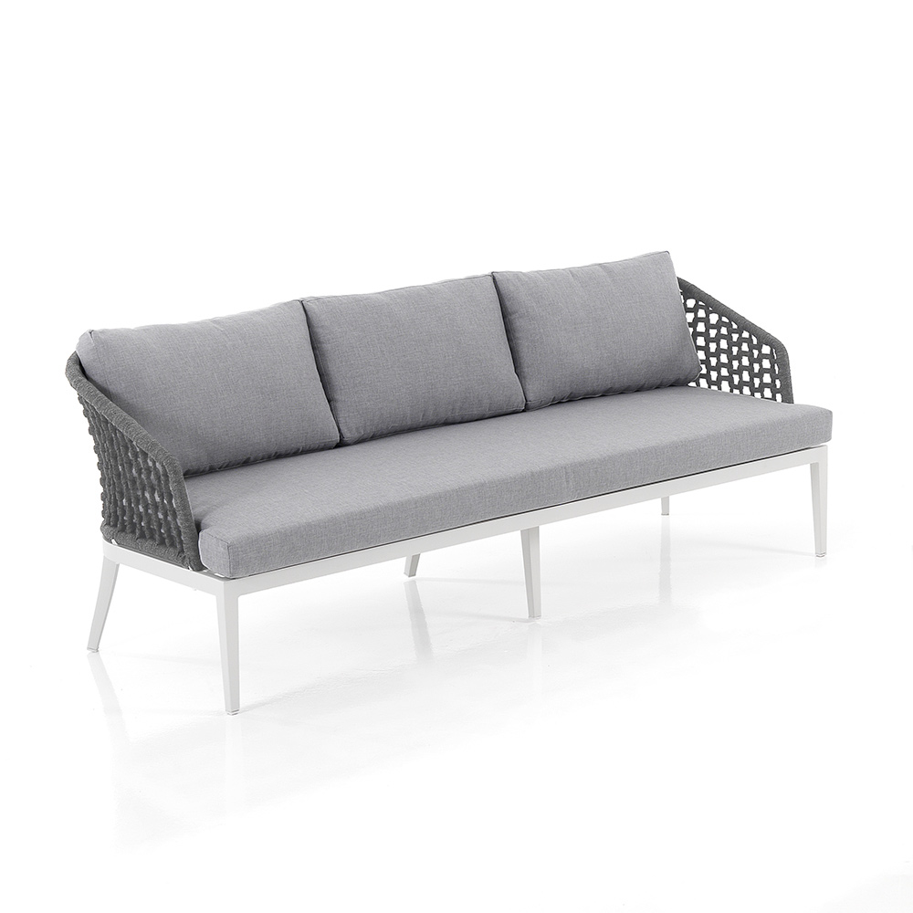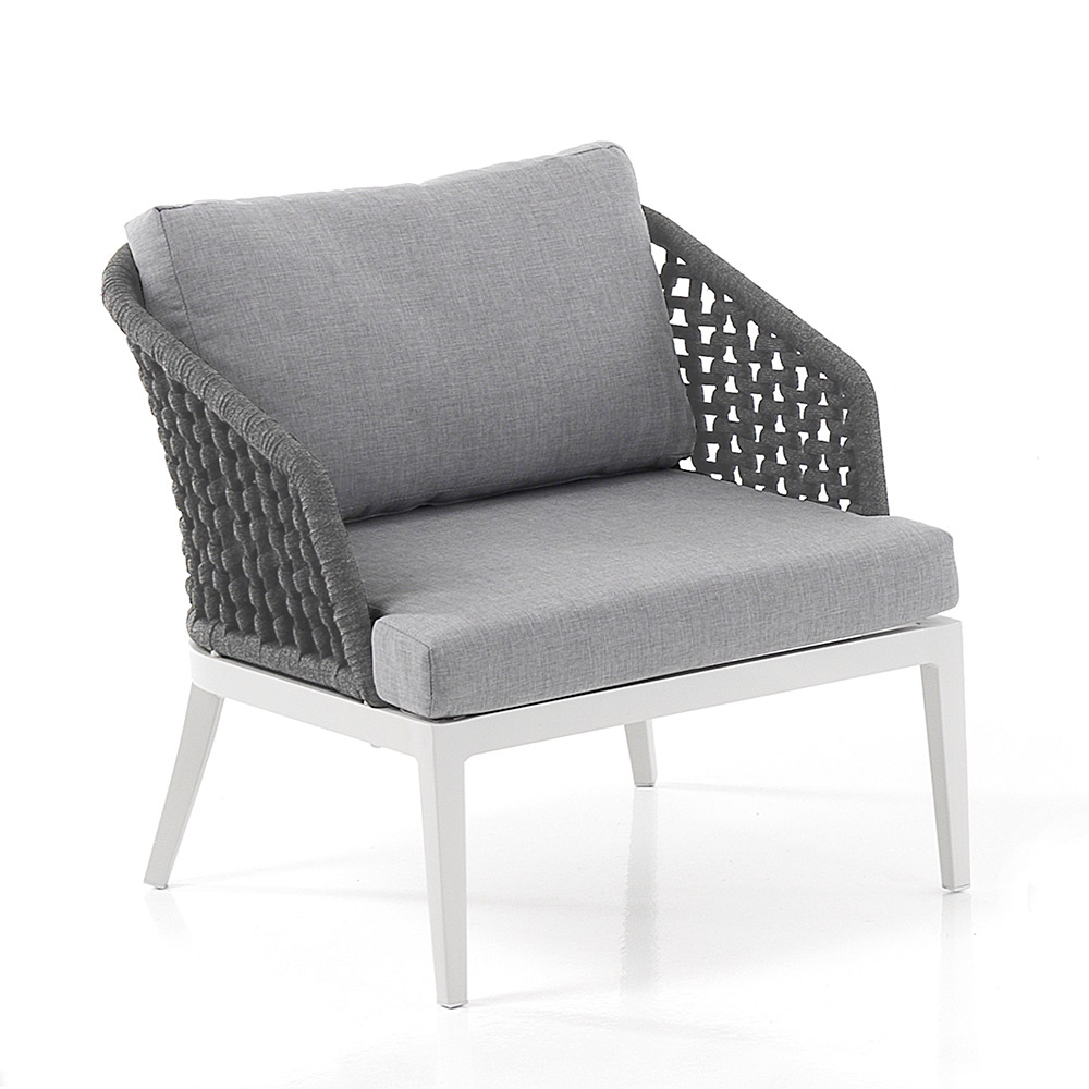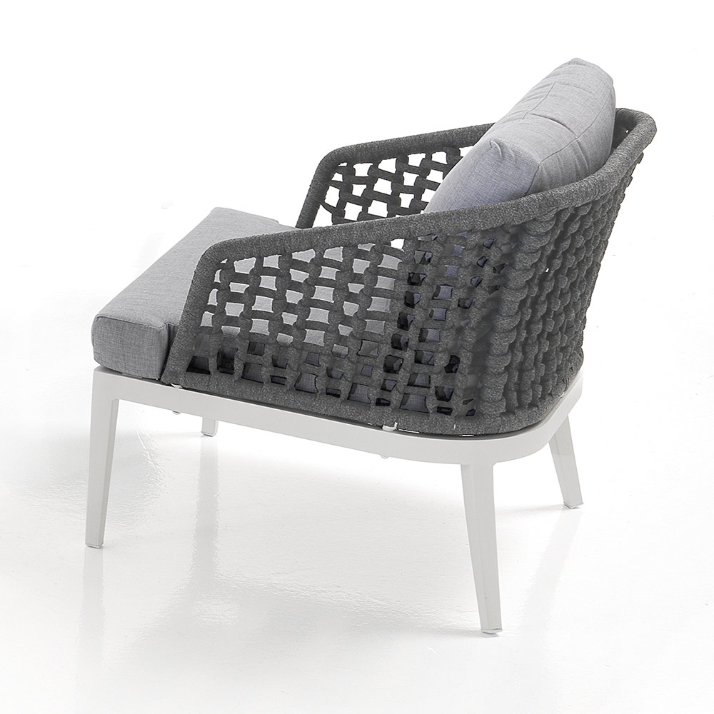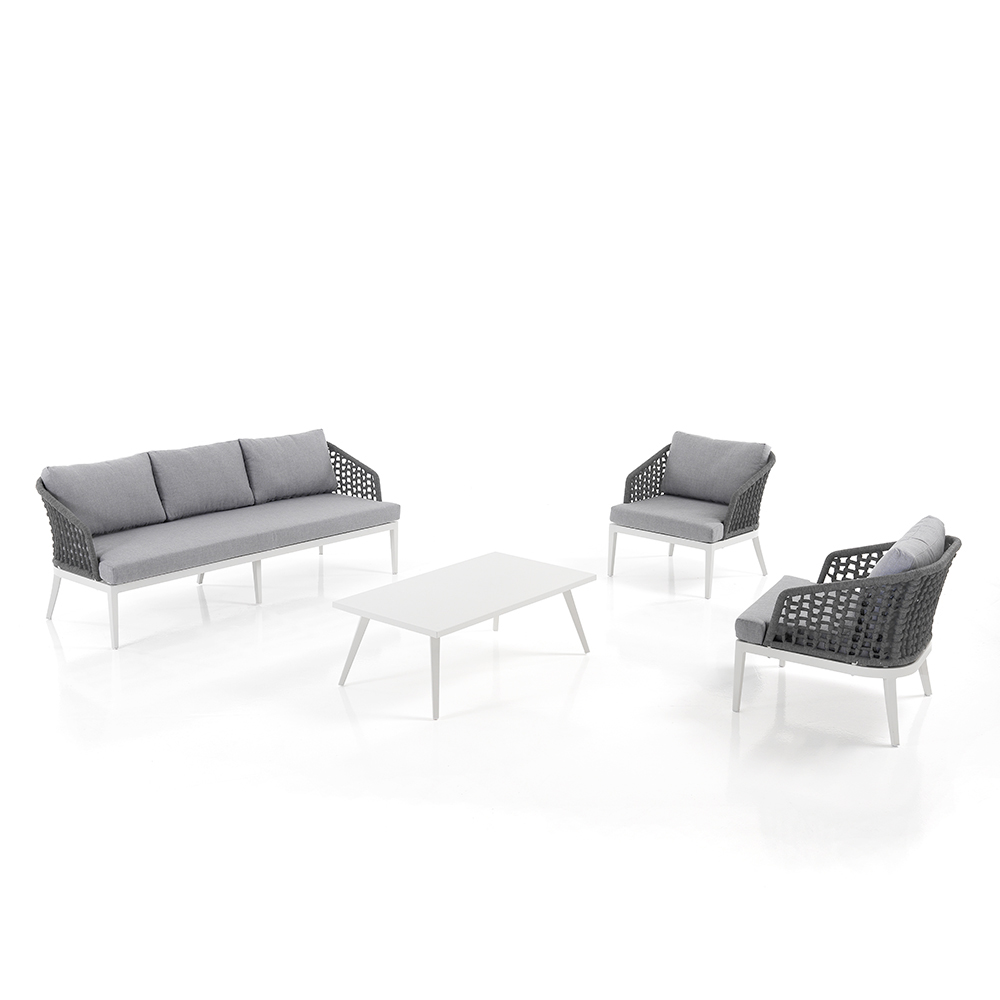 Ce salon avec table basse pour le jardin est un exemple de design raffiné et de confort . La combinaison des fauteuils et du canapé avec leur tissage sur une structure en aluminium donne un look élégant et contemporain , parfait pour ajouter une touche de classe à n'importe quel espace extérieur.