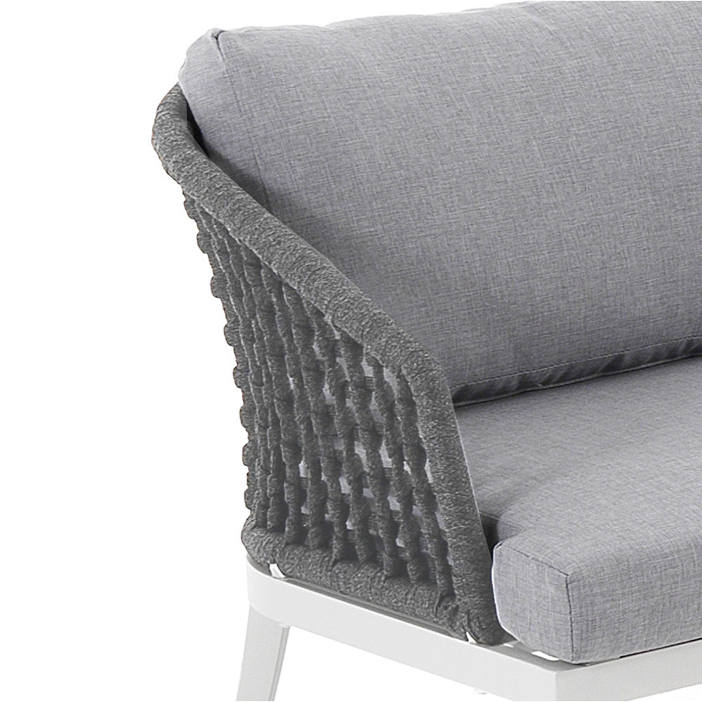 Les coussins gris clair offrent un confort douillet et un agréable contraste avec la structure sombre, invitant à la détente et à la conversation. La table basse assortie est idéale pour organiser des cocktails en soirée ou des petits-déjeuners en plein air, servant de point central pour se divertir et se détendre.