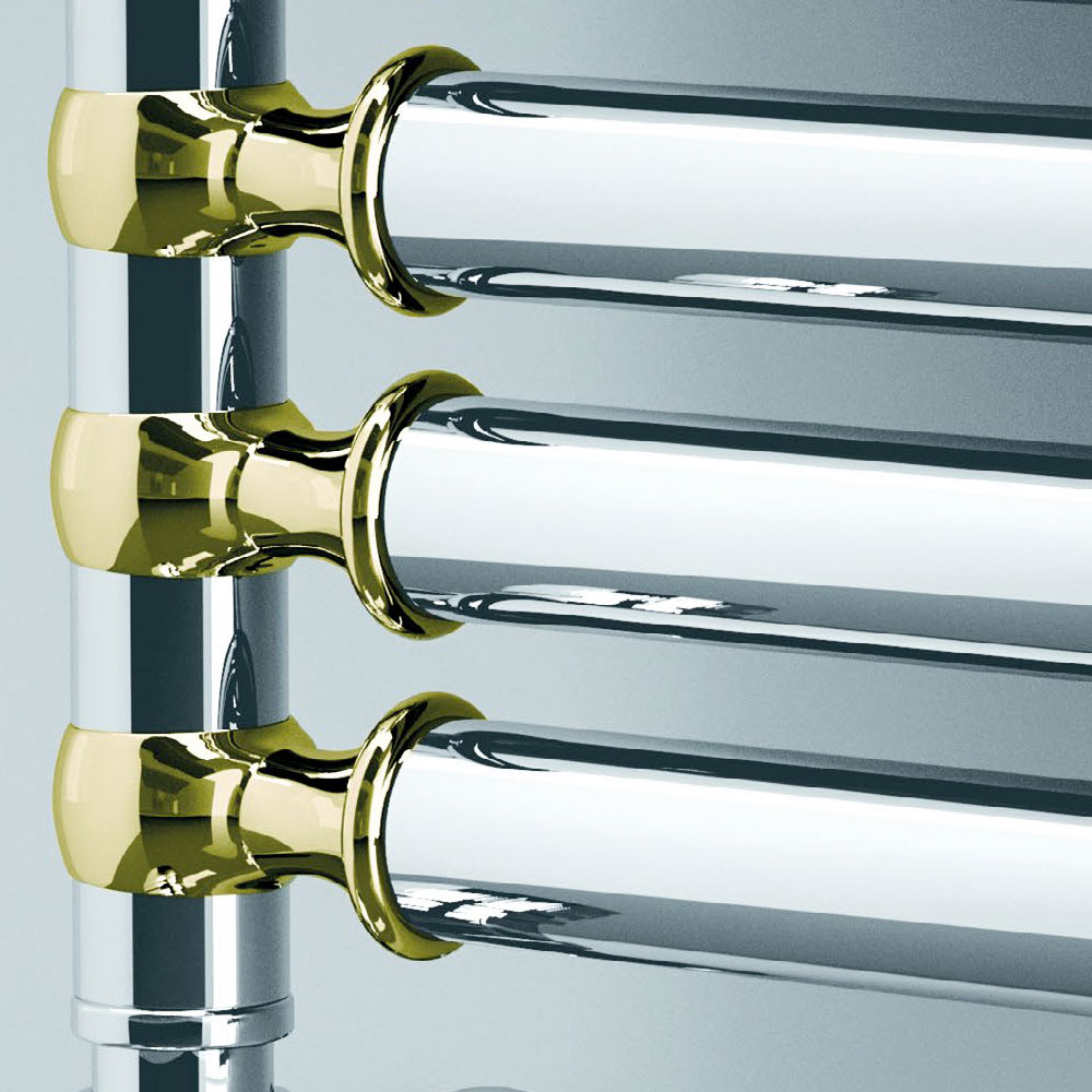 Ce radiateur en acier sophistiqué est la définition même de l'élégance et de la fonctionnalité. Le design fin et les multiples lignes horizontales optimisent non seulement la diffusion de la chaleur, mais offrent également une solution pratique comme porte-serviettes . La combinaison de l'acier poli avec des détails dorés apporte une touche de chaleur et de luxe, ce qui en fait un complément parfait aux salles de bains contemporaines ou classiques.