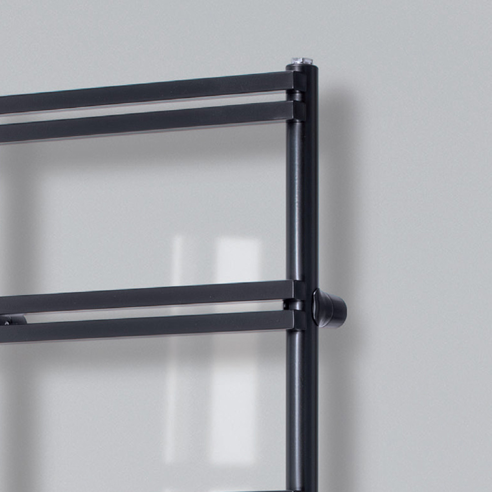Sèche-serviettes hydraulique en acier au carbonefinition noir de jais composé d'une série d' éléments horizontaux de section carrée de 2 cm soudés sur des collecteurs verticaux d'un diamètre de 3,5 cm, entièrement fabriqués en Italie avec kit de fixation murale, purgeur et bouchon aveugle inclus . Le caractère artisanal est la caractéristique qui garantit l'excellente qualité de ce produit typique du Made in Italy. Ce produit est capable de satisfaire les besoins et les désirs d'un utilisateur de plus en plus attentif et exigeant grâce aux finitions et aux matériaux de premier choix utilisés pour sa construction.
