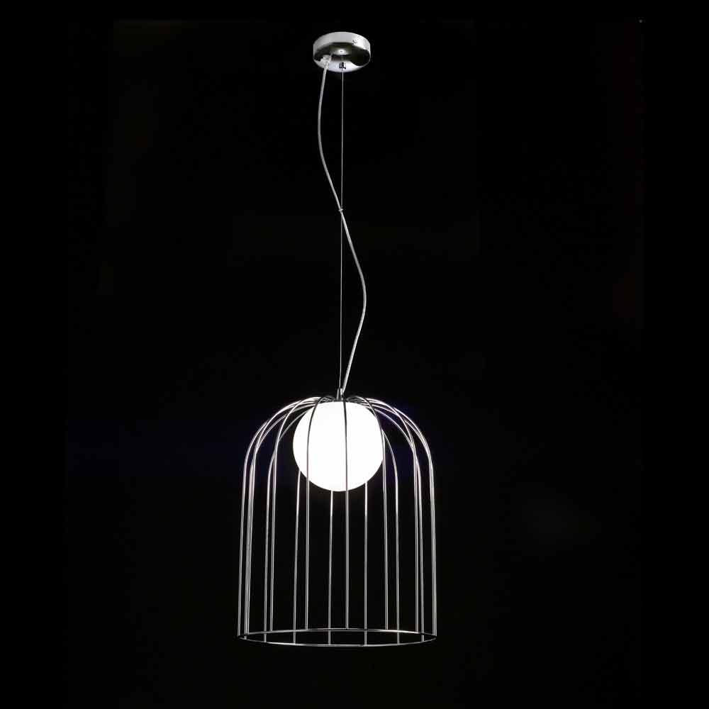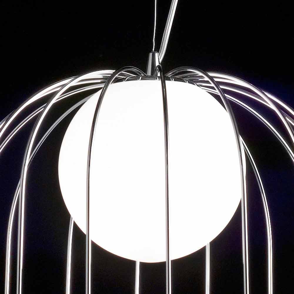 Selene Kluvi lampe suspendue en verre soufflé avec cage métalique made in Italy Kluvì est une collection de trois suspensions et trois lampes d' appui, composées par une cage métalique et une sphère en verre soufflé blanc lait .