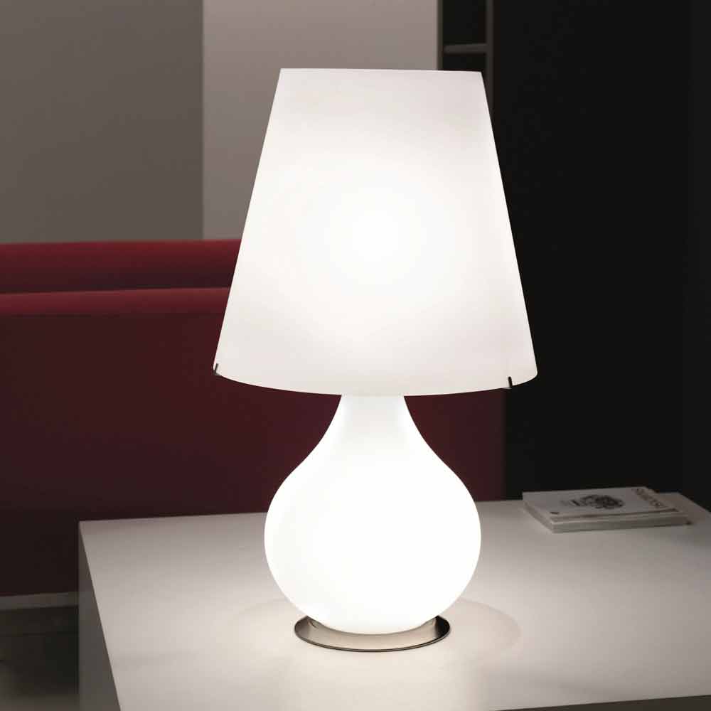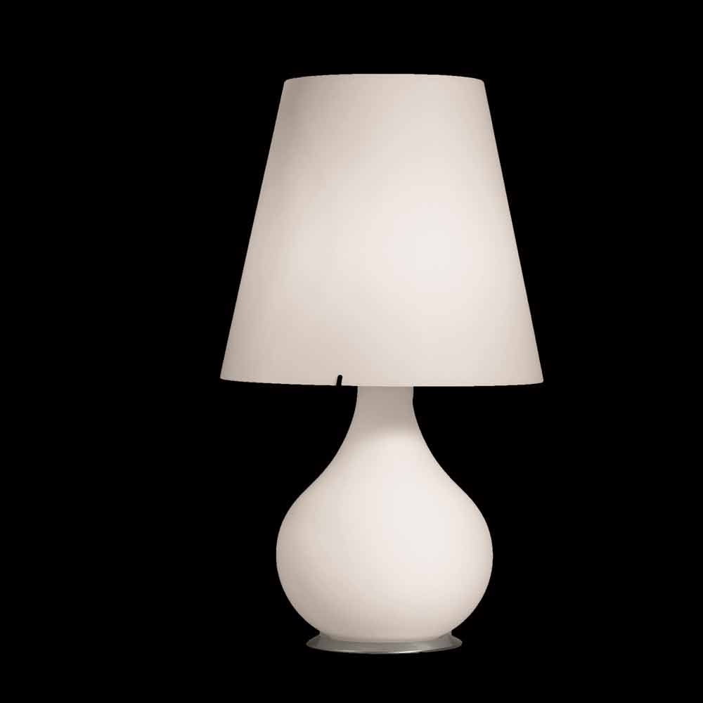 Selene Forever lampe de table en verre fabriquée en Italie Forever est une collection de trois lampes de table traditionelles, composées par la base et l' abat-jour en verre soufflé blanc. Les parties métalliques sont en nickel satiné, en plus les lampes ont un dispositif pour l' allumage, même séparé.