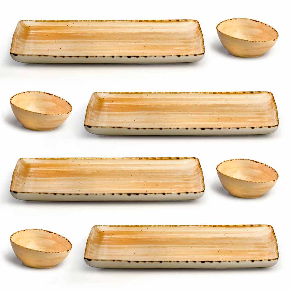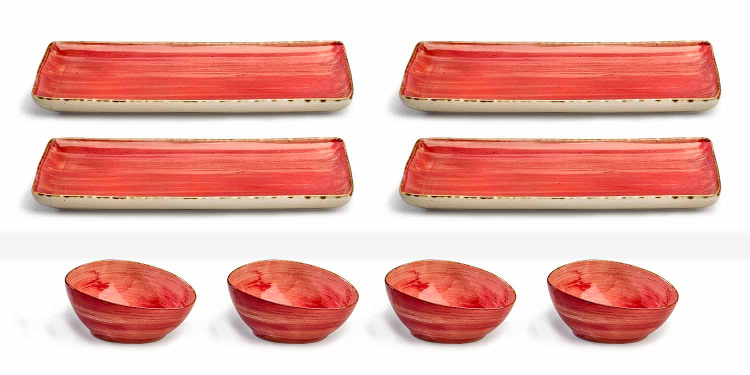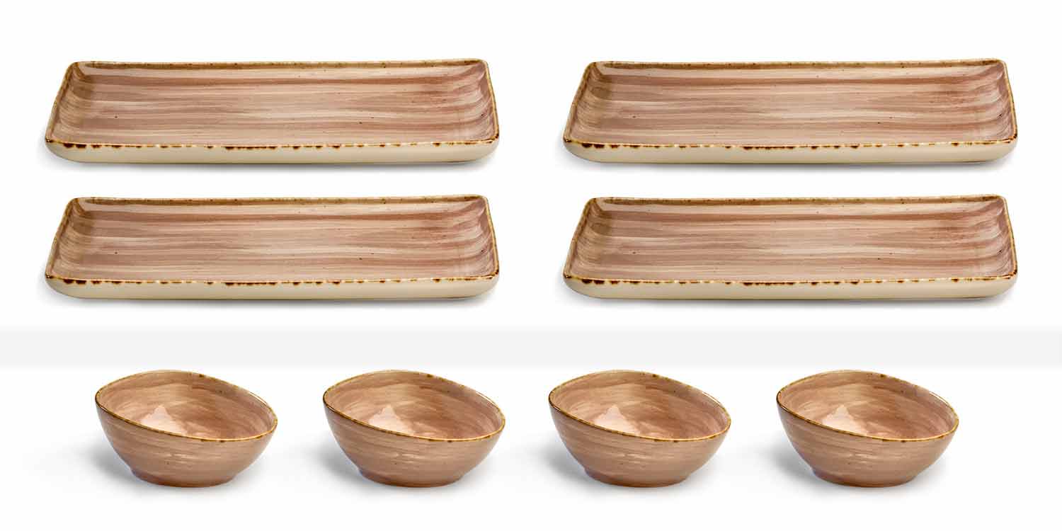 Plats de service au design moderne et polyvalent, 4 bols ronds et 4 assiettes rectangulaires en grès coloré.