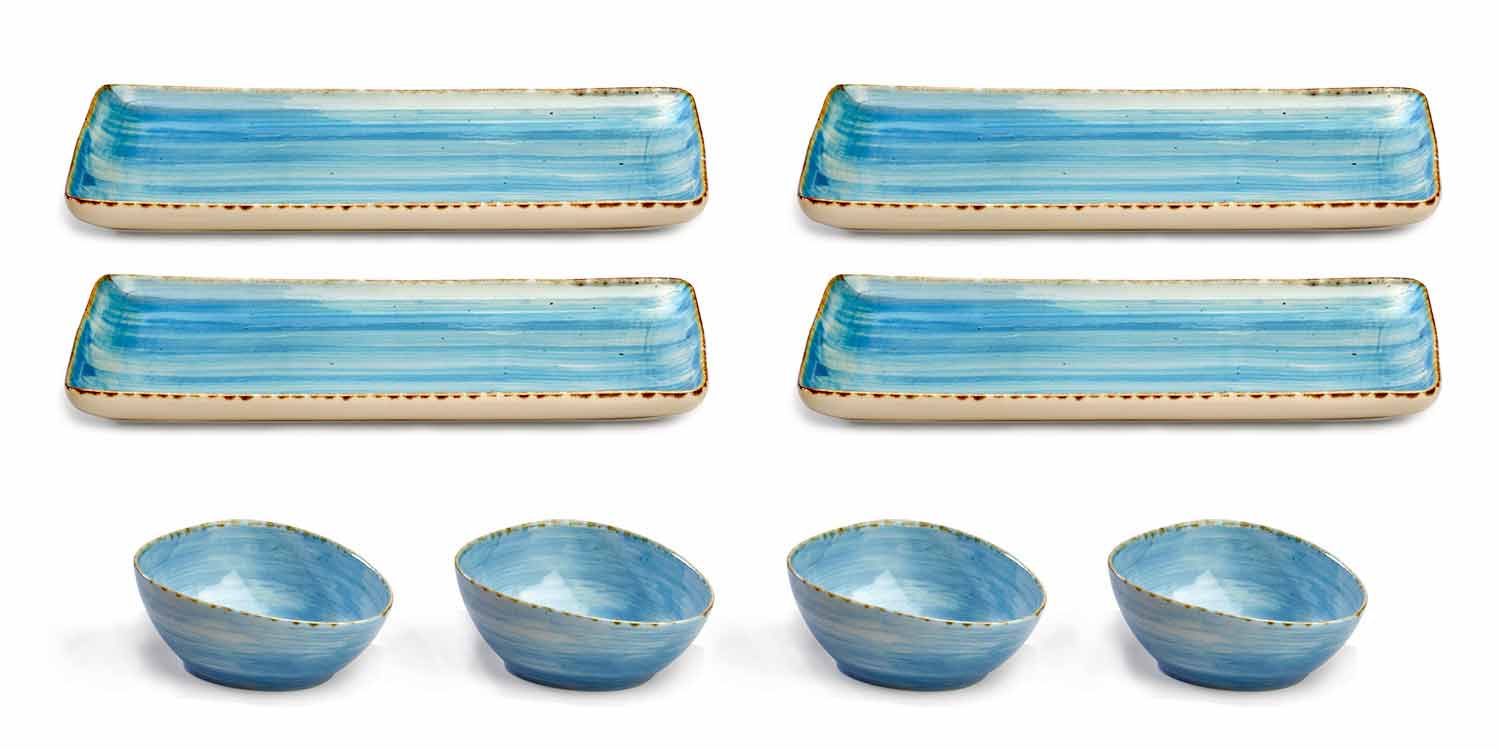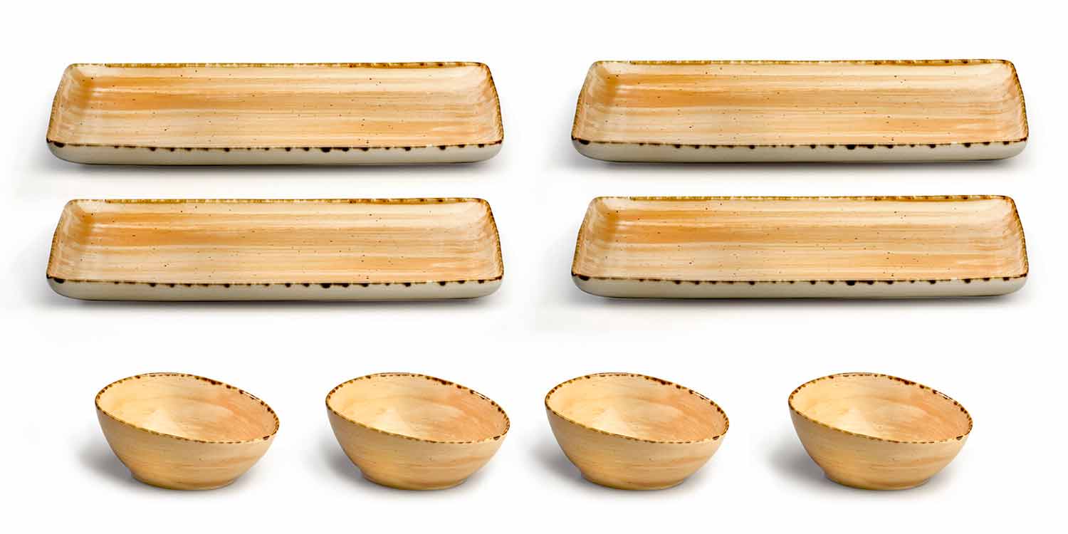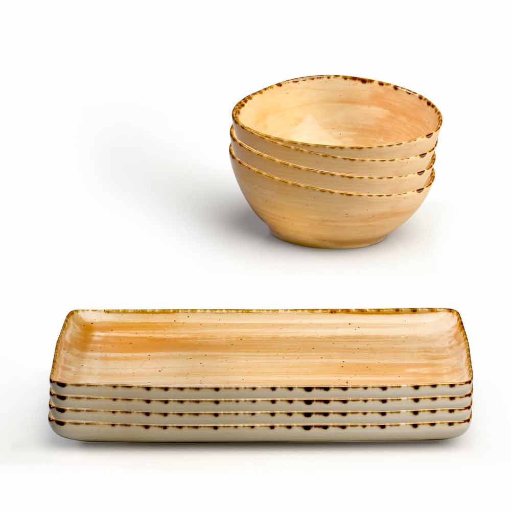 Plats de service au design moderne et polyvalent, 4 bols ronds et 4 assiettes rectangulaires en grès coloré.