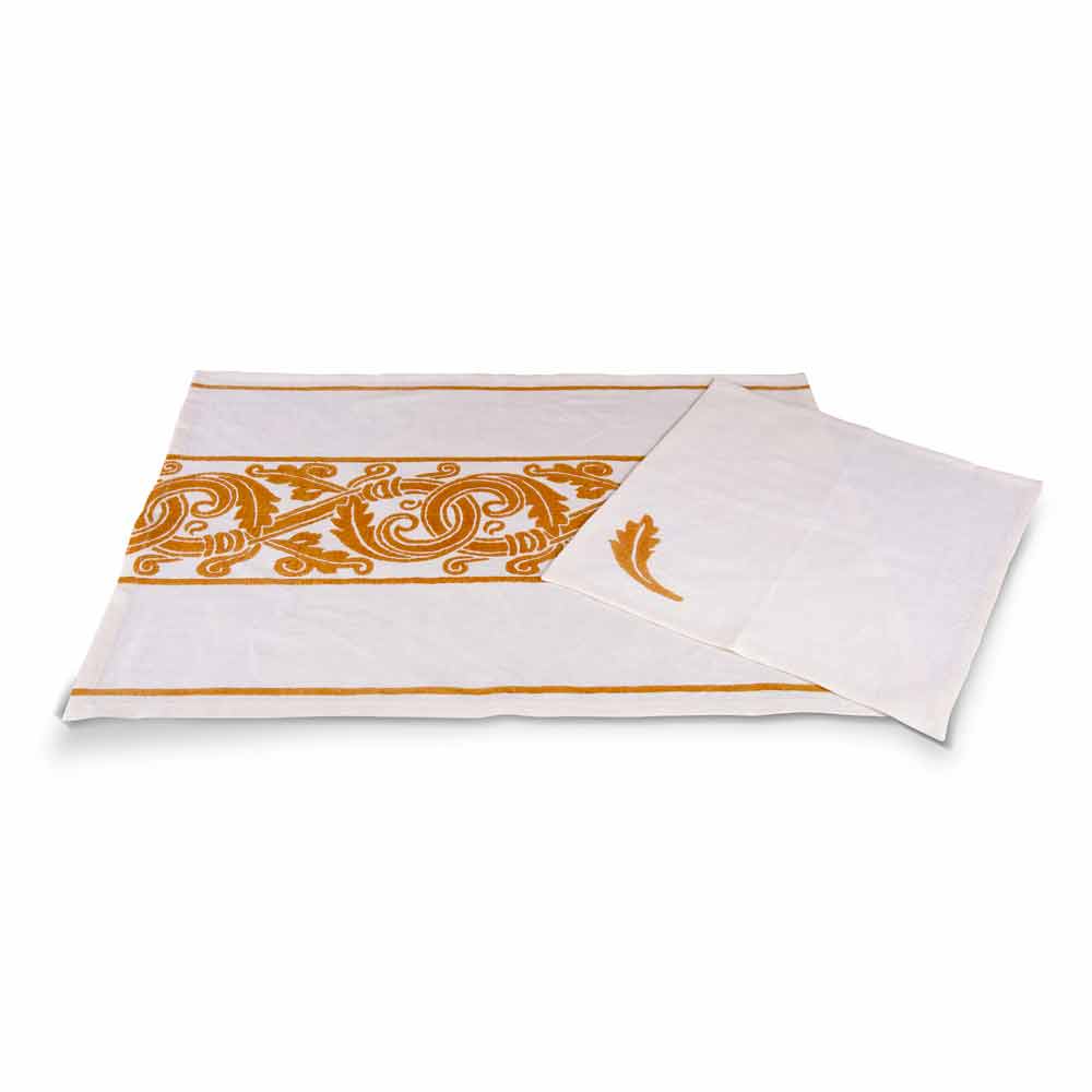 Set de petit déjeuner artisanal (napperon et serviette) en pur lin avec impression artistique sur des tissus anciens décorés à la main, disponible en trois variantes, une pièce unique de qualité fabriquée en Italie.