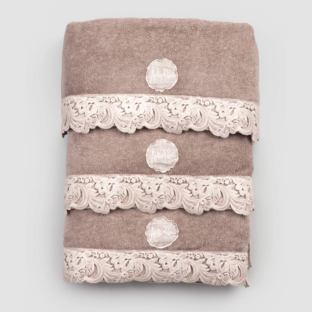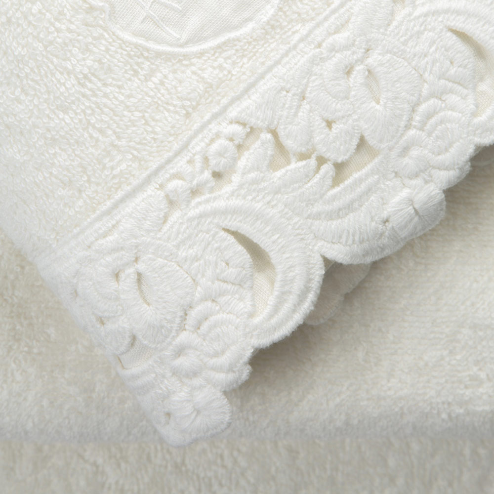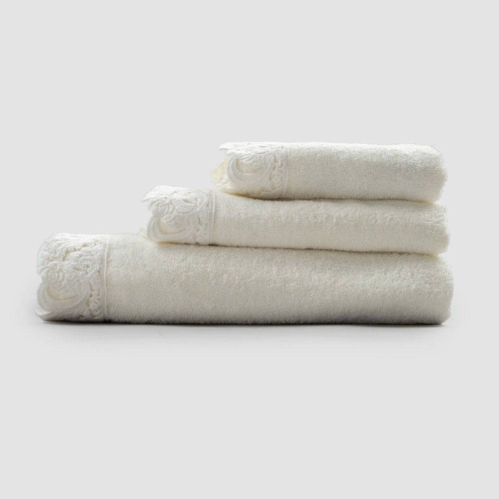serviette de bain en coton éponge avec harmonie dentelle d'un côté, et