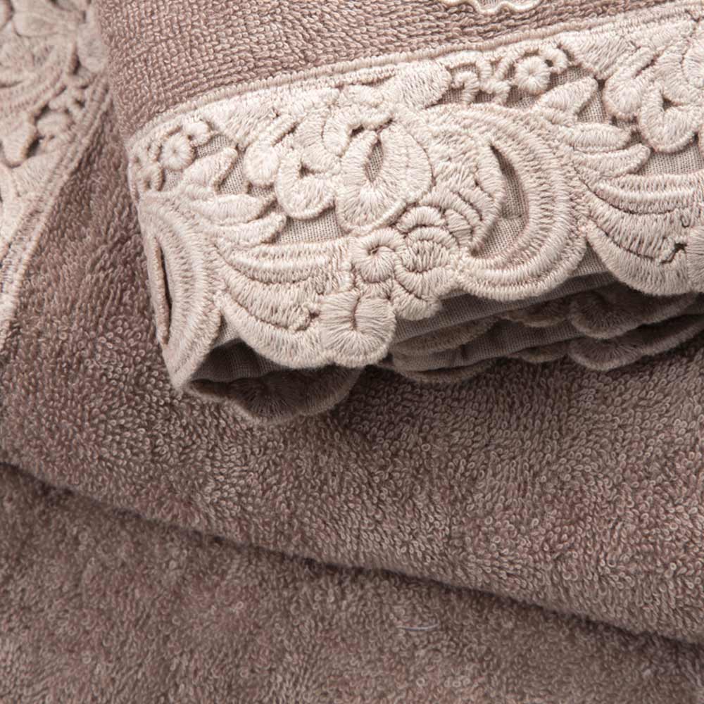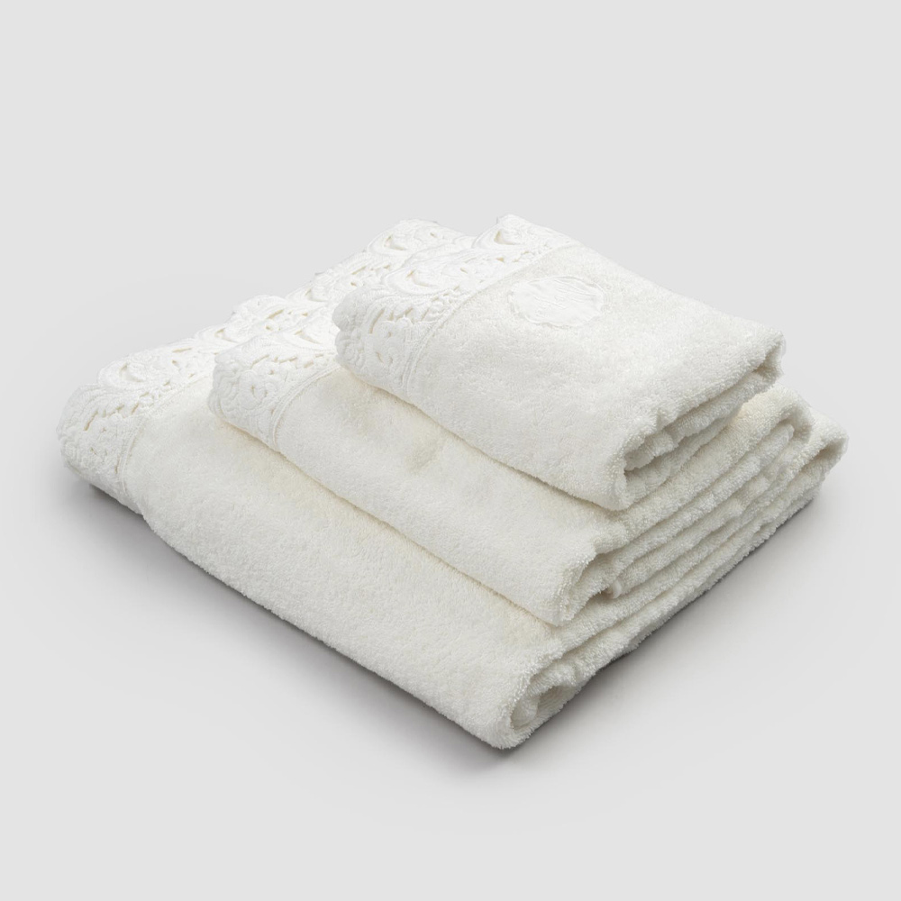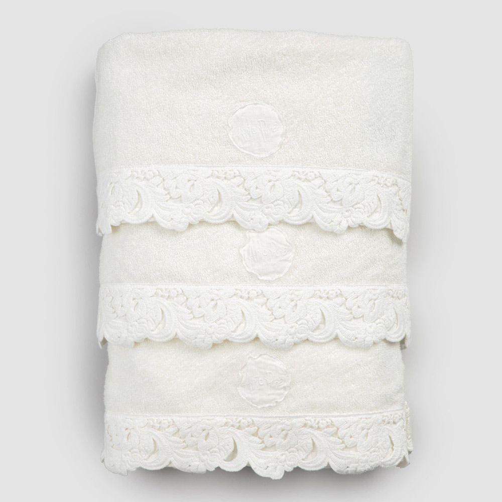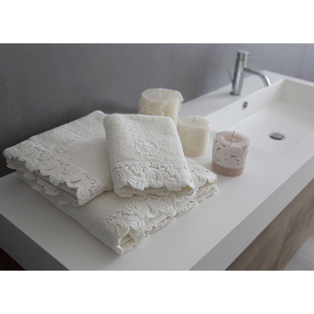 Service de serviettes pour le visage et les invités et serviette de bain en éponge avec dentelle, fait main de luxe fabriqué en Italie.