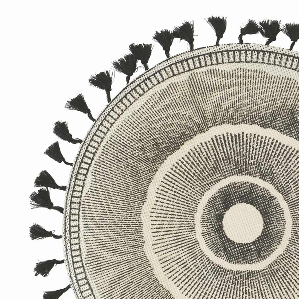 Set de table rond en jute blanc décoré de franges noires, 12 pièces.
