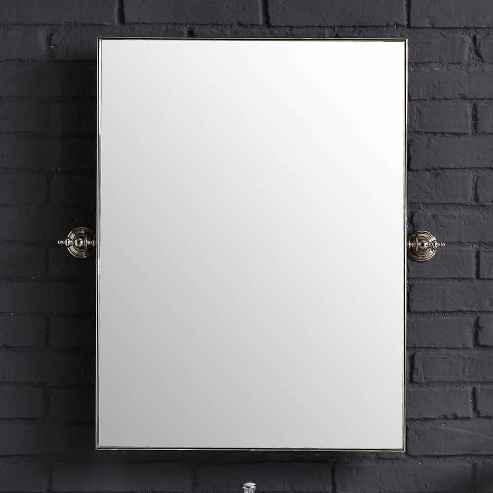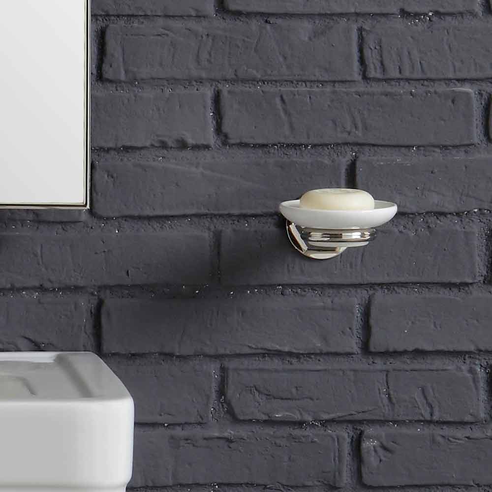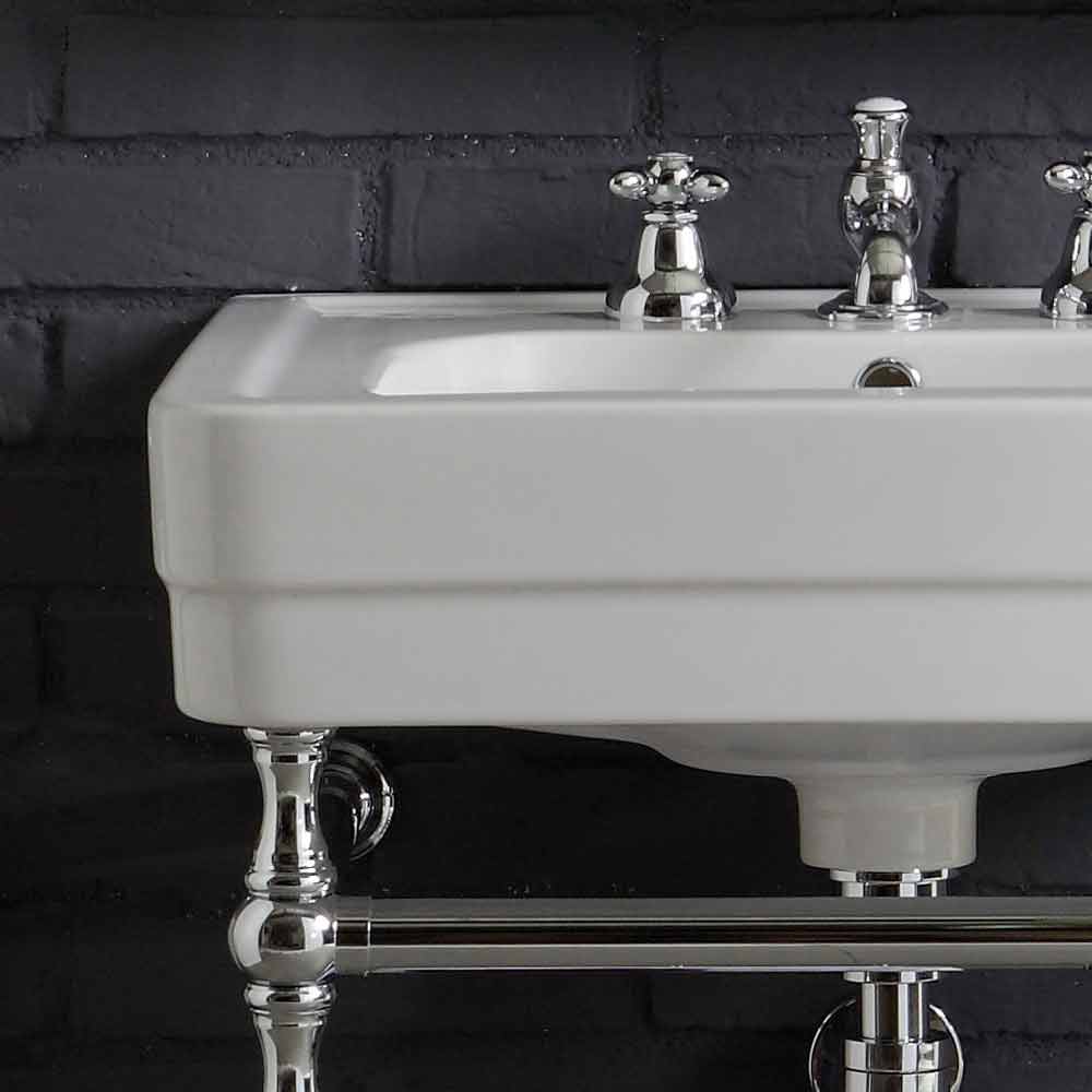Parties incluses dans la composition: - Lavabo en céramique blanche. Mesures: L. 50 cm x P. 40,5 cm - Piétement métallique complet avec grille, finition chromée L. 41 cm x H.76 cm x saillie murale 34 cm - Robinet avec drain - Siphon - Drainer - Miroir inclinable rectangulaire avec cadre en laiton chromé 76,5 cm x 57,5 cm. - Porte-serviettes anneau - Porte-savon mural en céramique