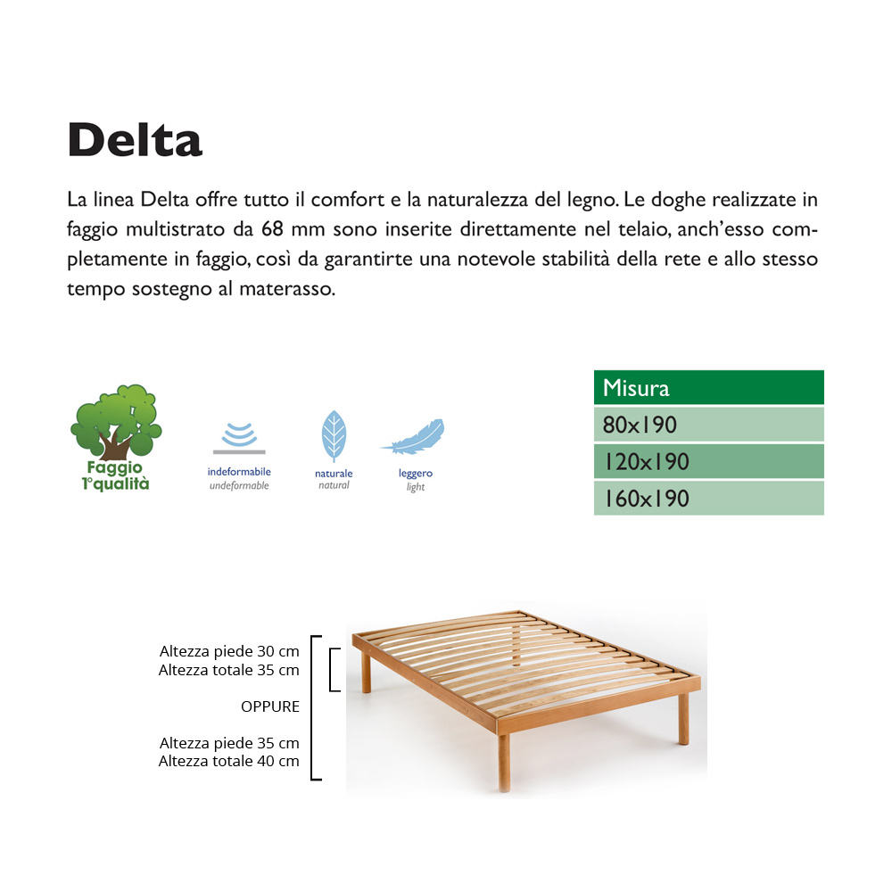 La ligne Bio delta offre tout le confort et le naturel du bois . Les lattes en hêtre multicouche de 68 mm sont insérées directement dans le cadre, également entièrement en hêtre, de manière à garantir une grande stabilité du sommier et en même temps à soutenir le matelas.