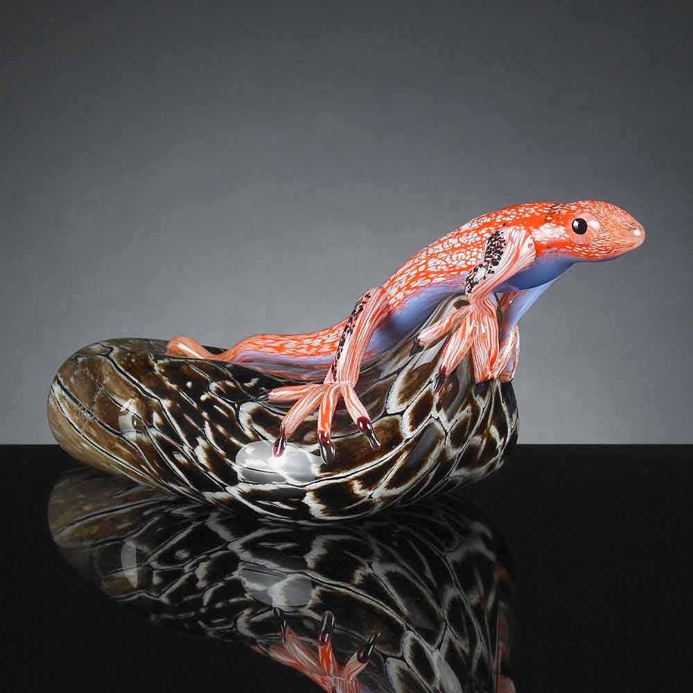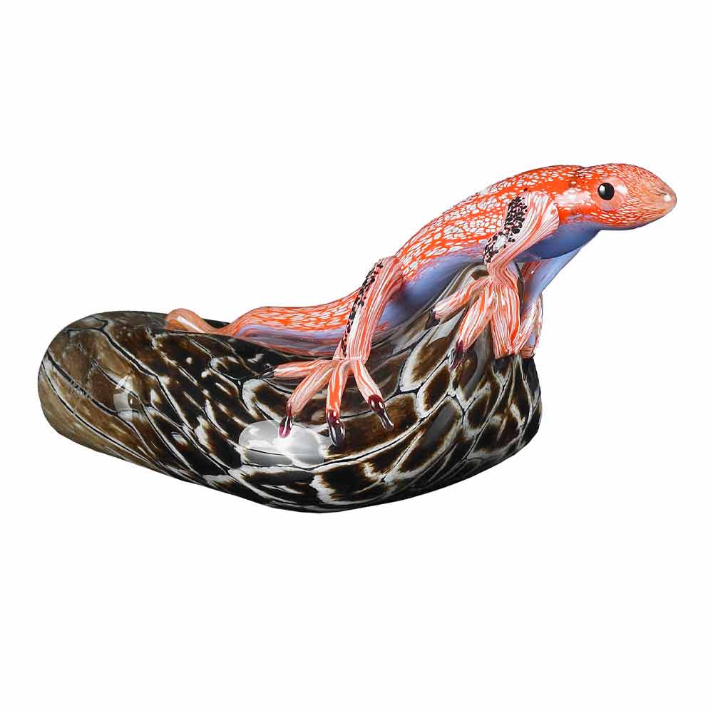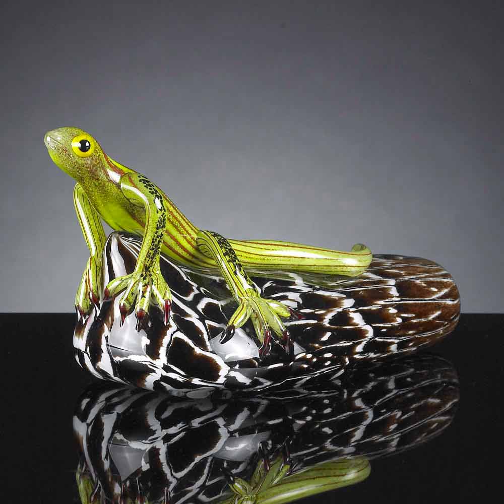 Ornement en forme de lézard sur une pierre en verre coloré Fabriqué en Italie, très bien.