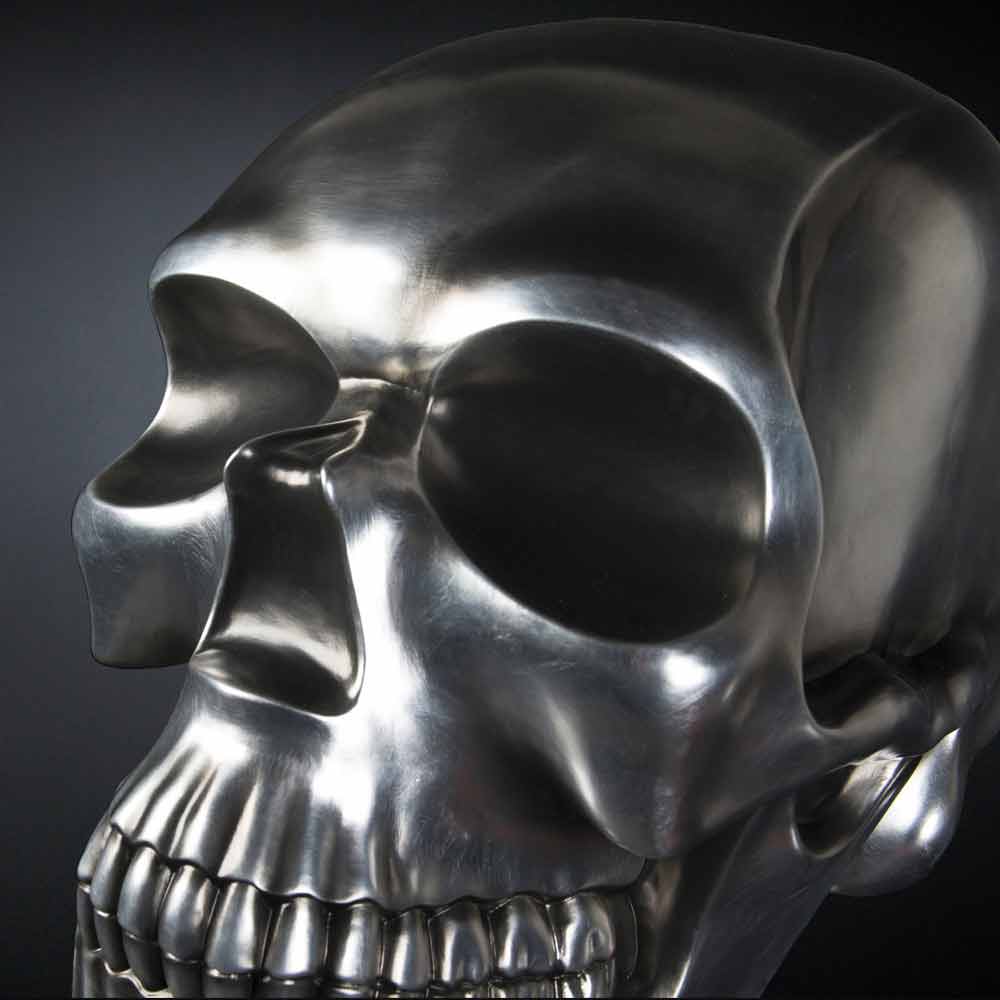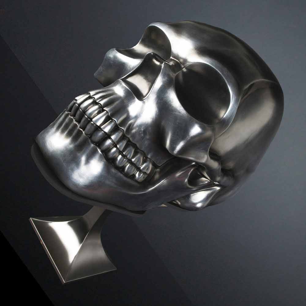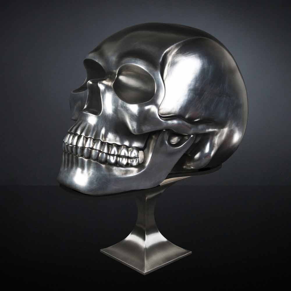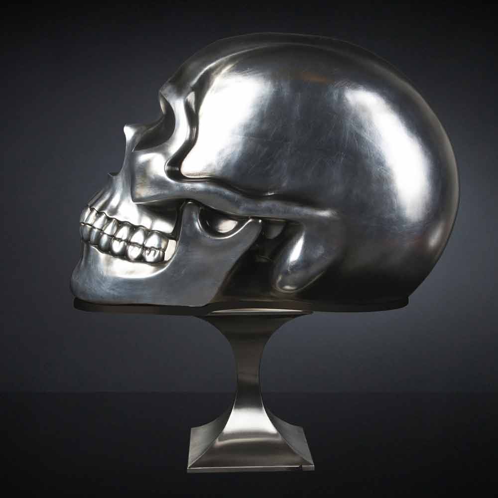Statue en forme de tête de mort fabriquée en Italie en céramique argentée, luxe.
