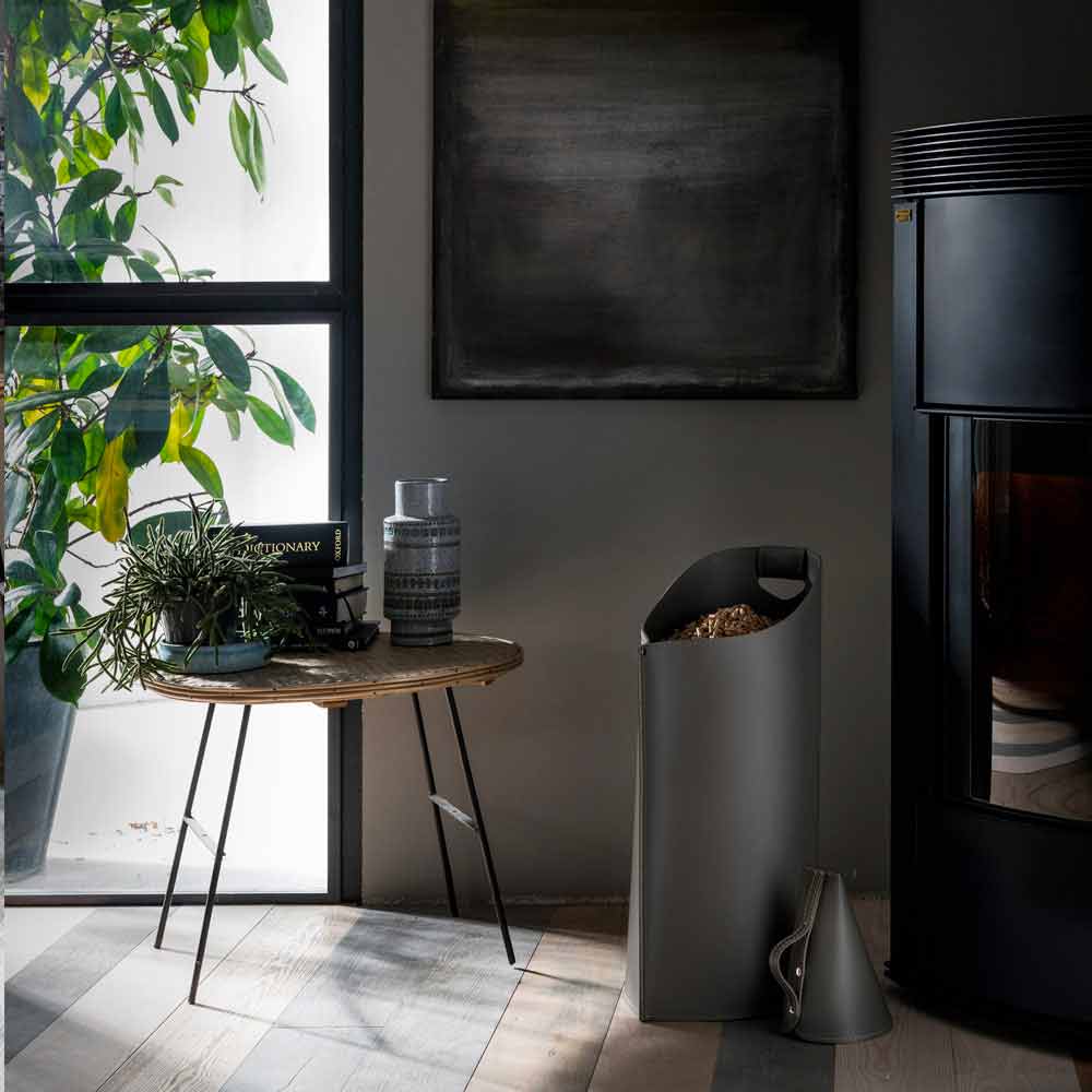 Ce panier à pellets est fait entièrement à la main en Italie par des artisans qualifié qui utilisent exclusivement des matériaux de haute qualité, comme le cuir régéneré. La base est fait en bois stratifié. Il est équipé d'une poignée.