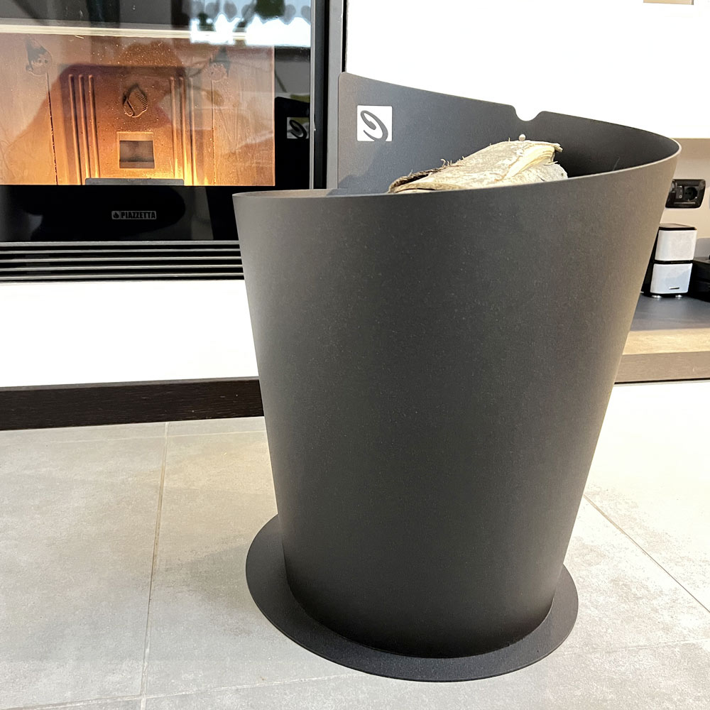 Porte-bûches rond de design moderne et minimal pour cheminée d'intérieur en acier noir, fabriqué en Italie.