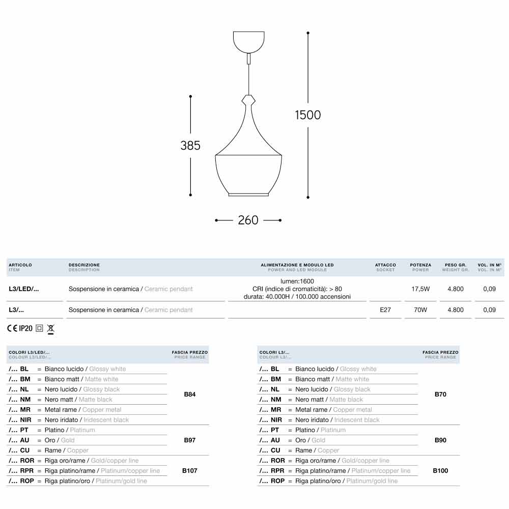I Lustri 3 est disponible dans plusieurs finitions et avec douille pour ampoule standard E 27 ou lumière LED.