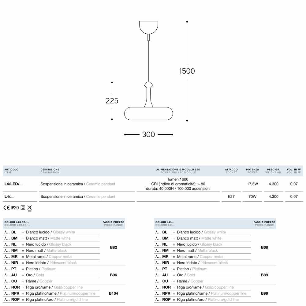 Suspension de design moderne en céramique ILustri 4par Aldo Bernardi. I Lustri 4 est disponible dans plusieurs finitions et avec douille pour ampoule standard E27 ou lumière LED.