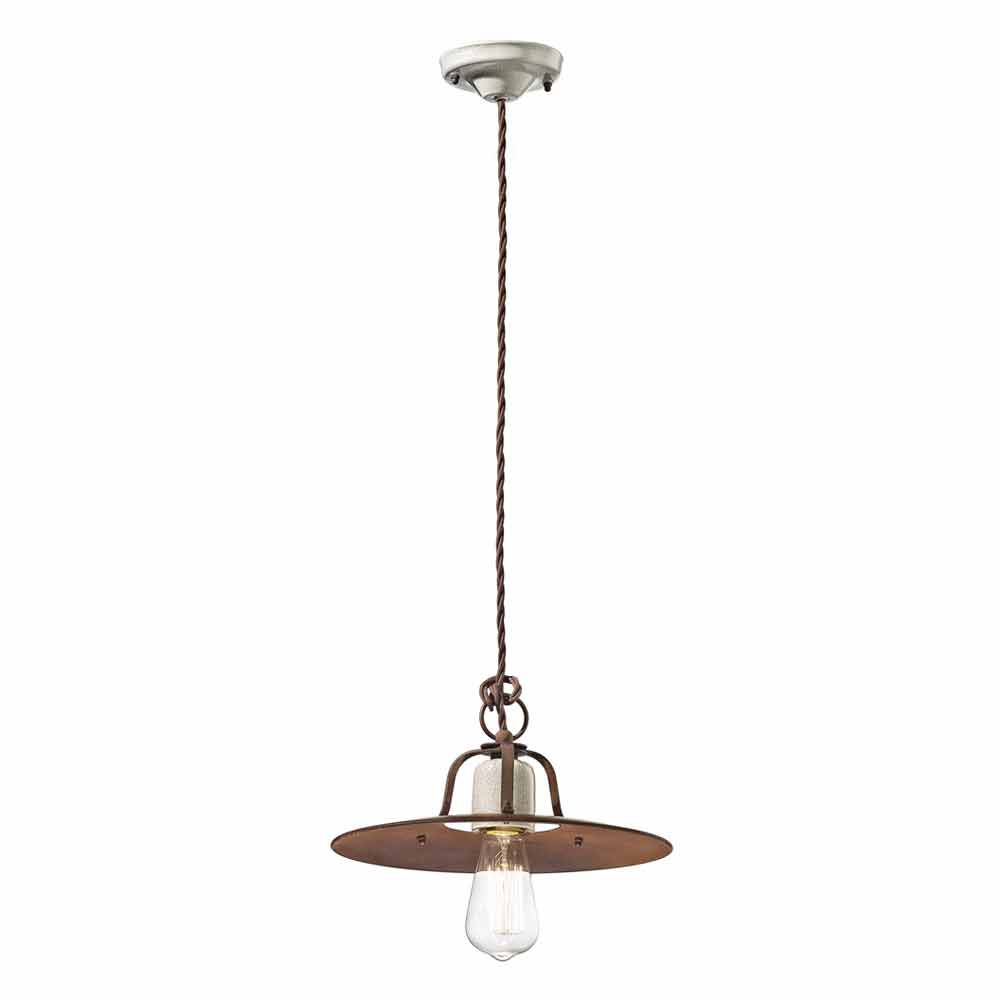 Lampe à suspension de style industriel par Ferroluce Couronne large et hauteur facilement réglable grâce au câble tressé qui complète le style industriel. Métal rouille mat et détails en céramique pour compléter un équilibre entre les formes pleines et vides. Il s'inspire du style rustique américain. Cette lampe, avec ses couleurs sombres et sa saveur vécue, est simple et intemporelle. Lumière pure sans blindage.