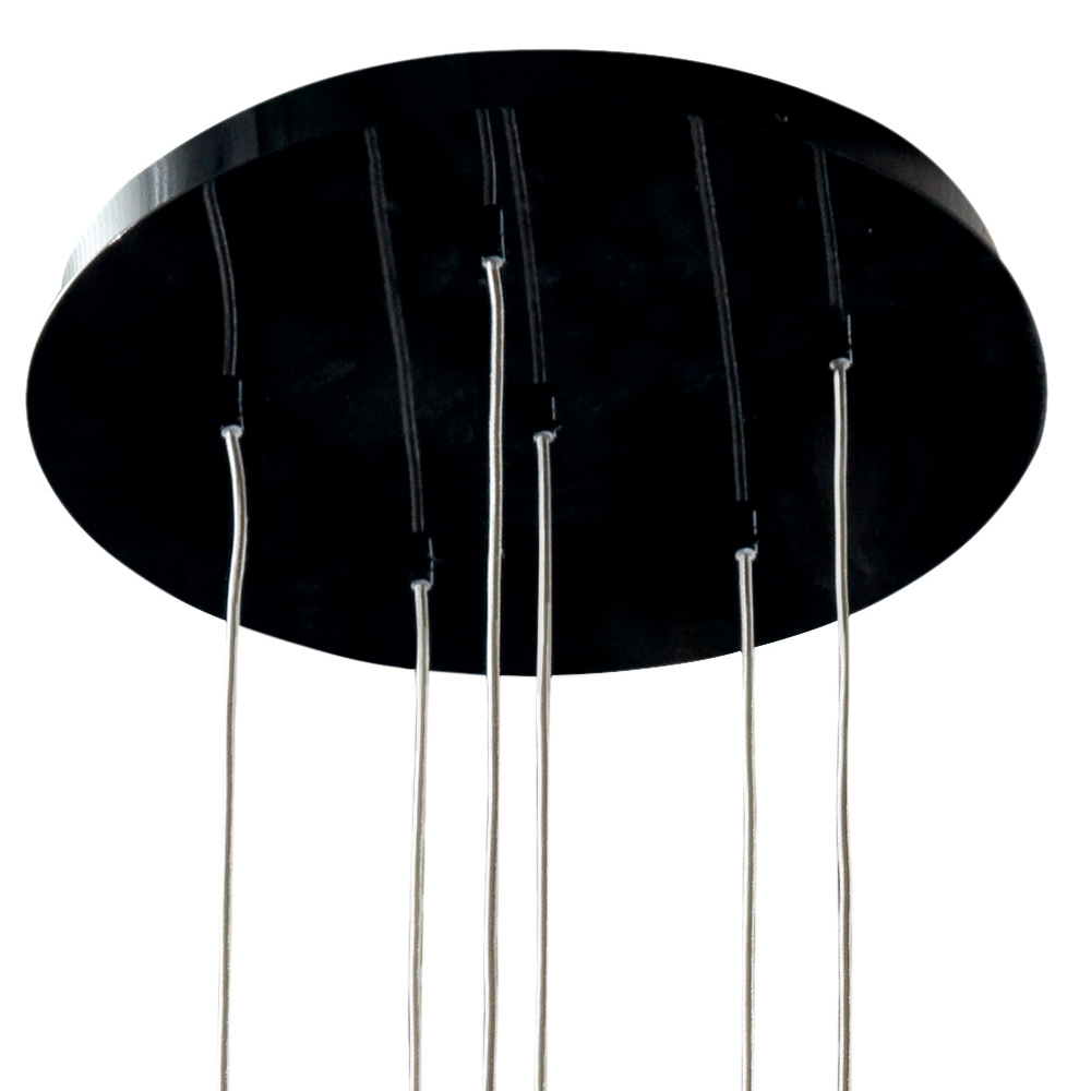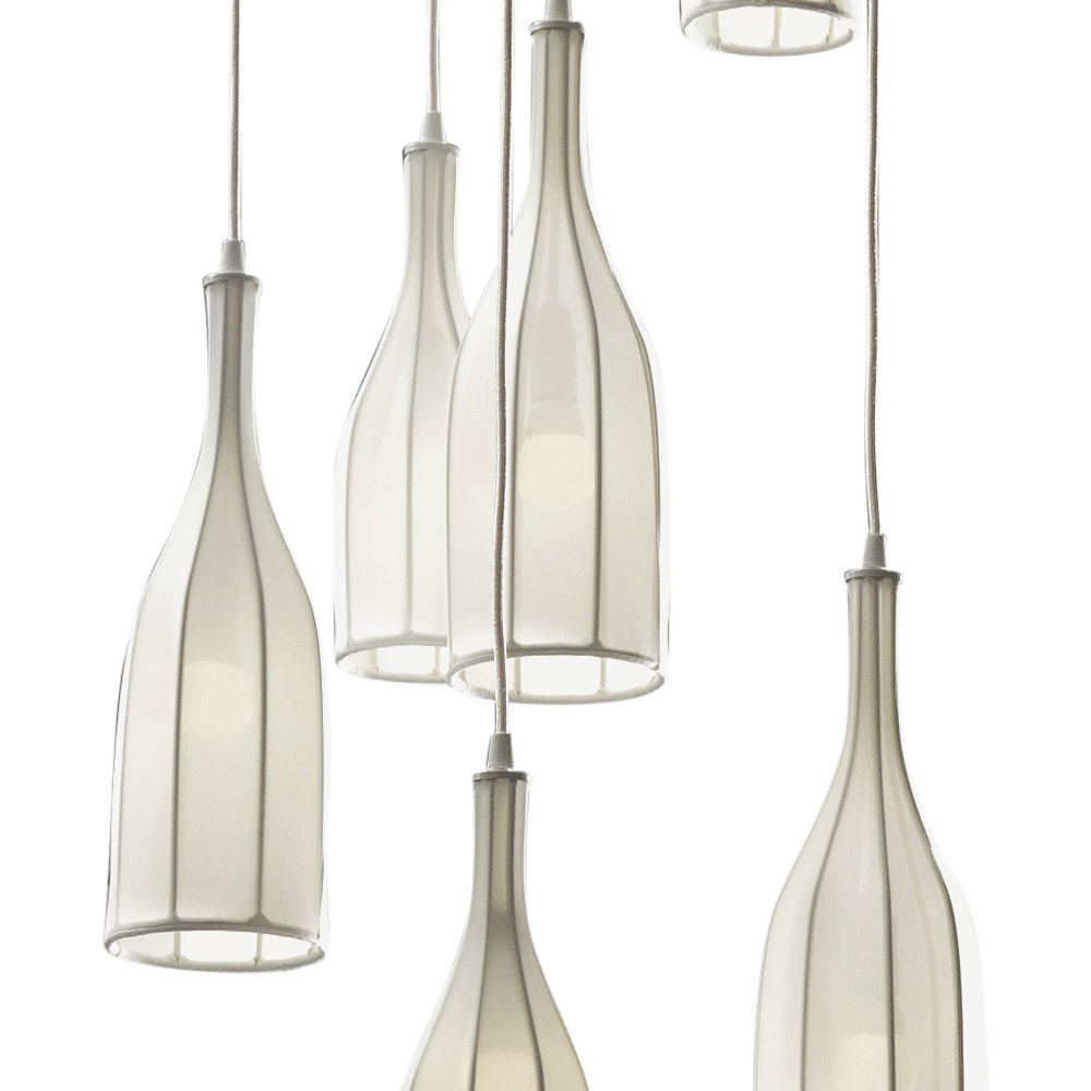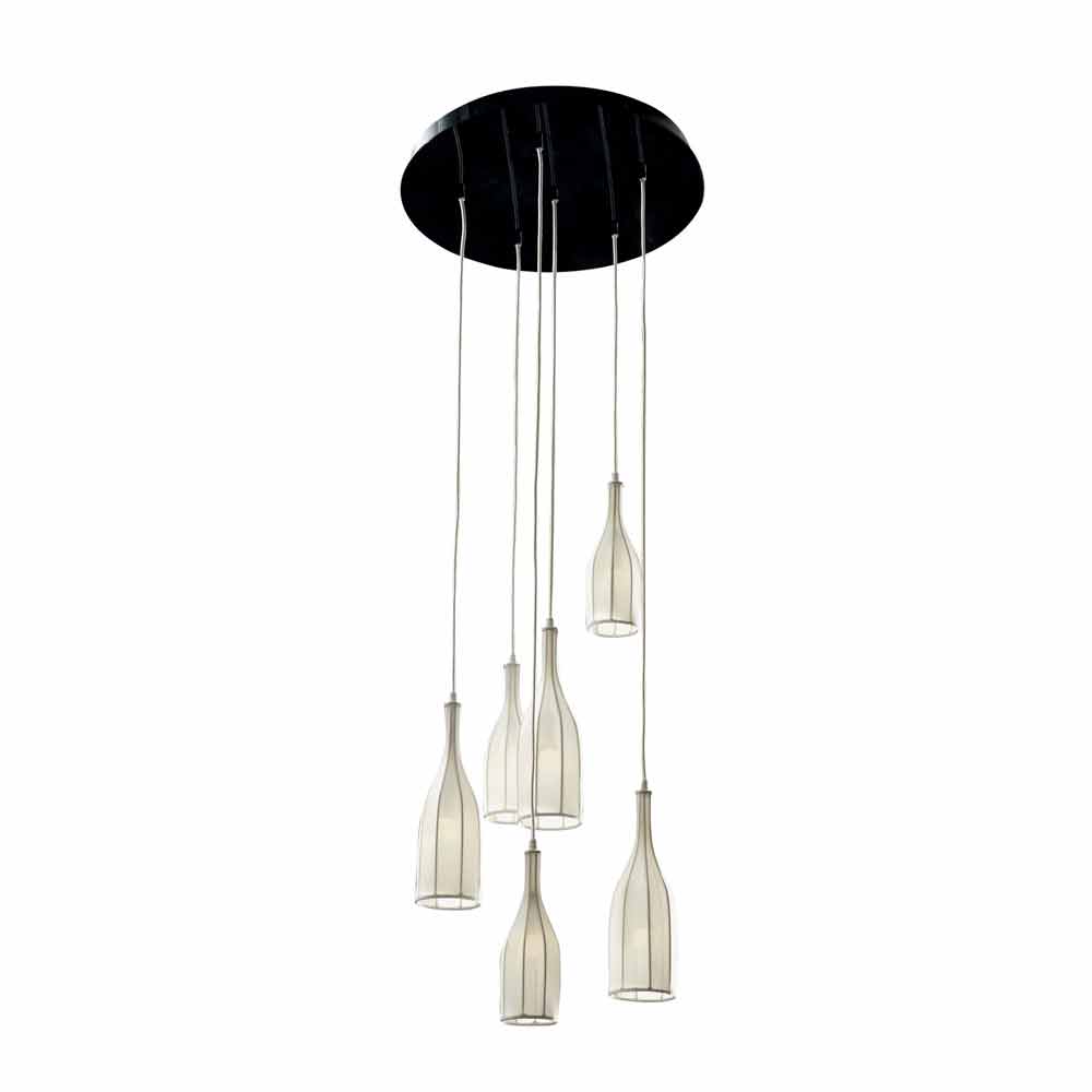 Composé d'une structure en métal laqué et de six abat-jours en tissu. Grâce à ses formes sinueuses, il saura s'adapter à tout type d'environnement, en donnant style et élégance.