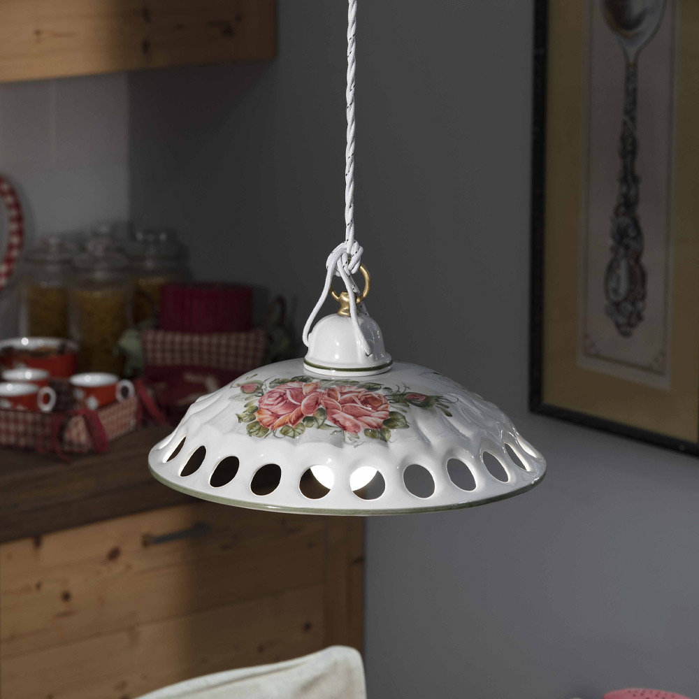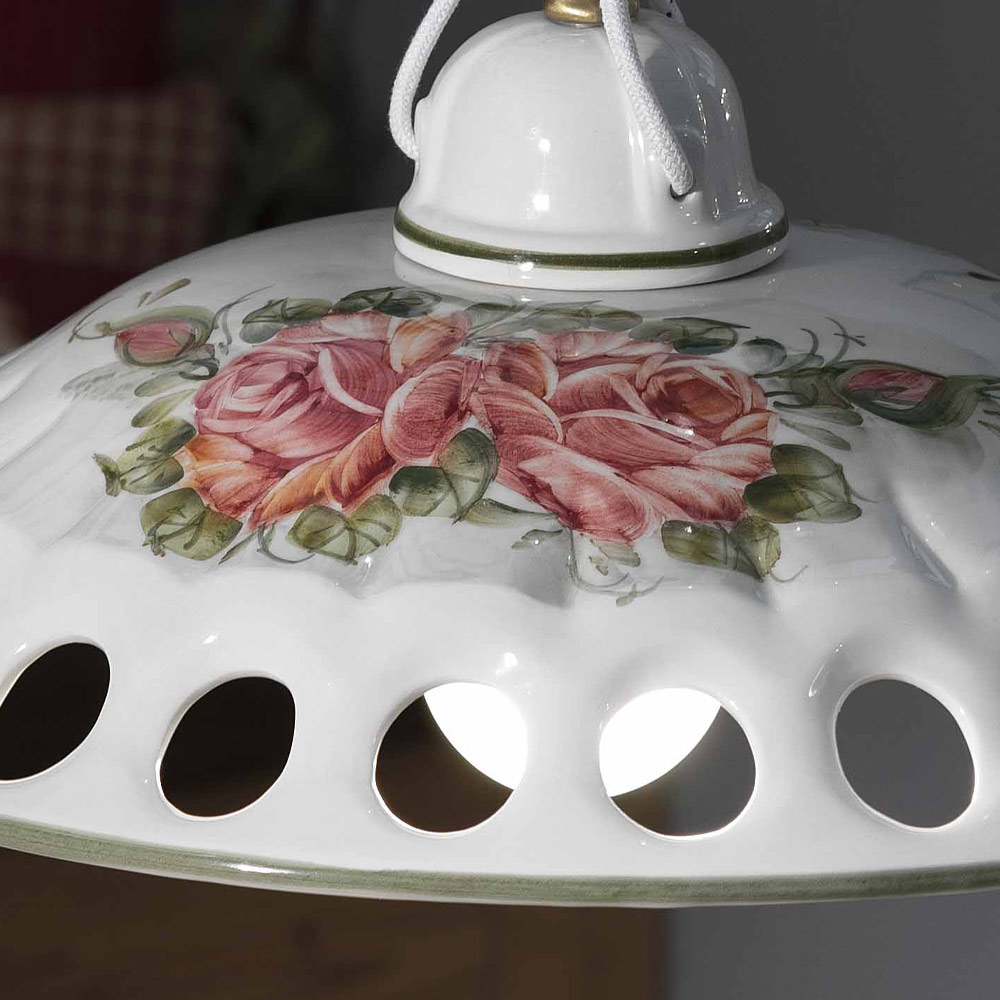 Cette lampe suspendue il est entièrement fait de métal et de céramique peinte à la main avec des décorations florales qui mettent en valeur l'habileté et la dextérité des artisans.