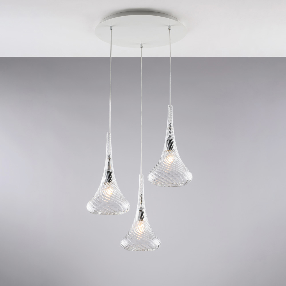 Légère et élégante, cette suspension en fer forgé et verre Pyrex, réalisée à la main, offre un éclairage au design raffiné et contemporain. Les trois diffuseurs en verre Pyrex , aux formes douces et sinueuses, sont suspendus individuellement, créant un effet dynamique agréable et une diffusion de lumière harmonieuse et enveloppante.