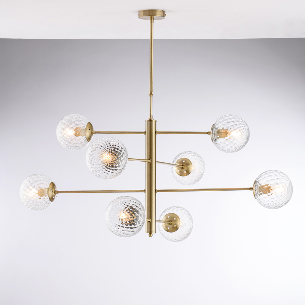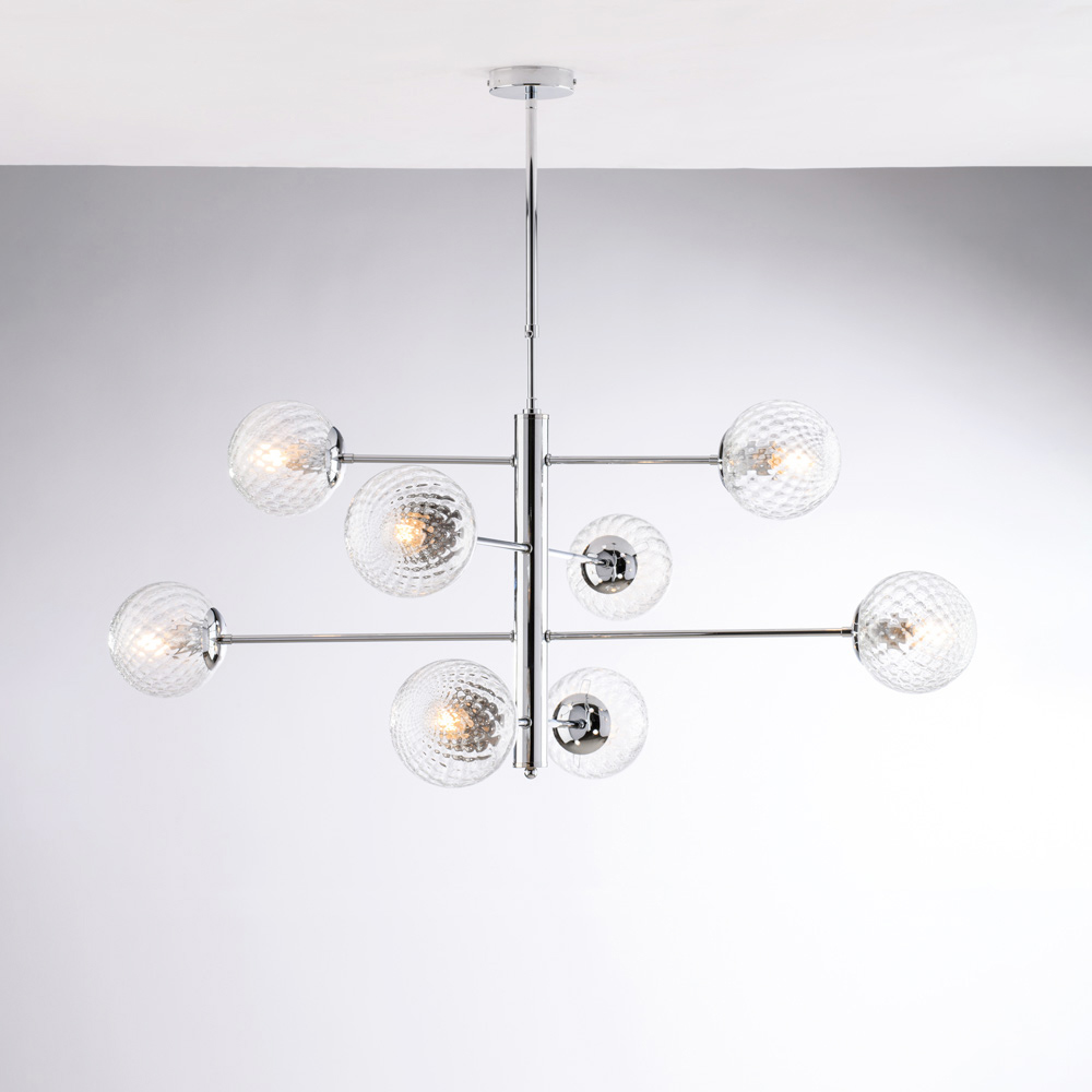 Élégante et contemporaine, cette suspension en fer forgé, réalisée artisanalement, se distingue par sa composition géométrique équilibrée. Les bras horizontaux soutiennent des diffuseurs sphériques en verre, créant un jeu de symétries raffiné qui diffuse une lumière harmonieuse et douce.