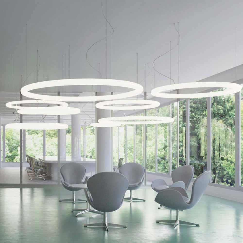 Lampe à suspension avec structure en polyéthylène blanc fabriquée en Italie avec rosace en métal laqué blanc mat , LED 55W Max 3400 Lumen et 3 câbles de fixation au plafond à longueur réglable. Article fourni avec cordon d'alimentation blanc. Le design de ce meuble moderne est parfaitement décrit par son nom, Giotto. En fait, sa forme est un cercle parfait caractérisé par une géométrie essentielle mais avec un grand impact visuel enrichi par la LED qui, grâce à une lumière homogène et accueillante , crée des effets d'éclairage parfaits pour les espaces contractuels et les environnements privés. Grâce à la possibilité de régler la hauteur du produit, il est possible de l'utiliser individuellement pour une solution plus discrète mais toujours originale, ou même en combinant les différentes tailles disponibles pour créer de merveilleuses compositions personnalisées donnant ainsi vie à des jeux de lumière à l'intérieur de la pièce.
