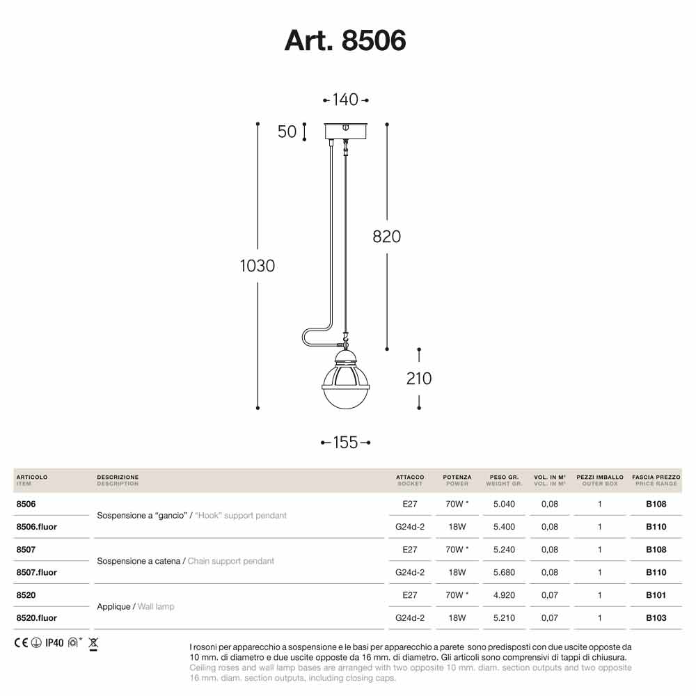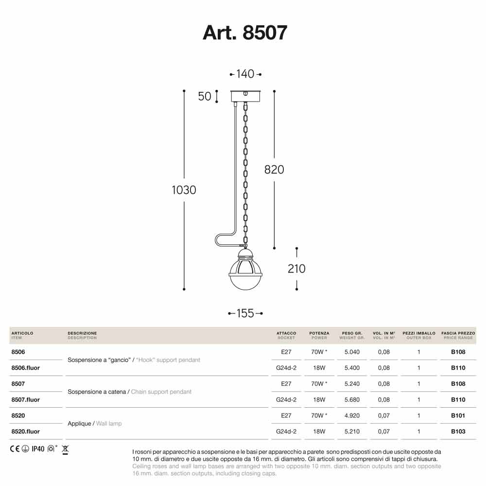 Cimosa est disponible avec support, avec crochet ou avec chaîne et avec différentes douilles: