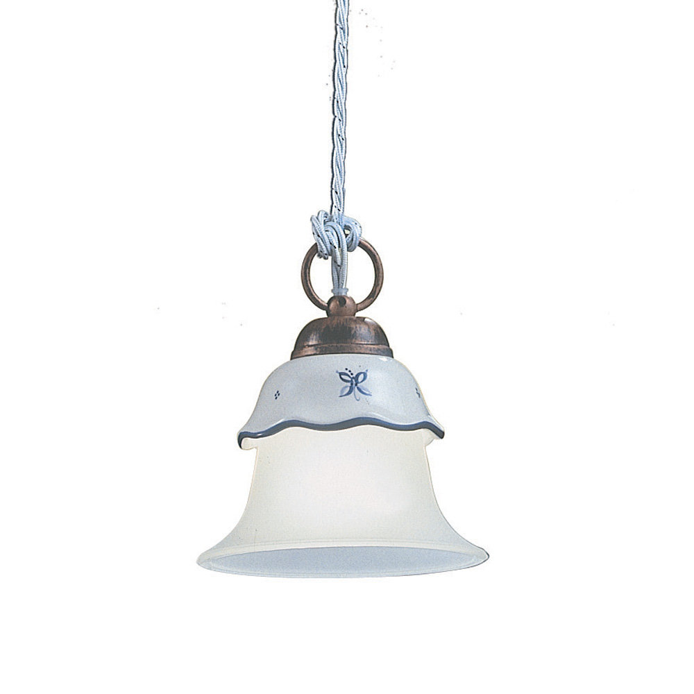 Lampe suspendue 3 lumières en fer, céramique décorée à la main et verre dépoli à l'acide fabriqué en Italie par Ferroluce.
