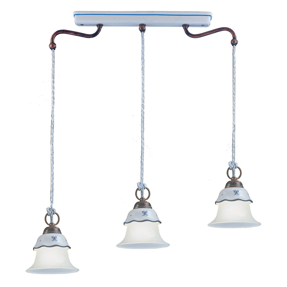 La suspension 3 lumières est entièrement en fer et cordons torsadés avec des festons en céramique avec des décorations peintes à la main et des cloches en verre gravé qui mettent en valeur le savoir-faire et la dextérité des artisans.