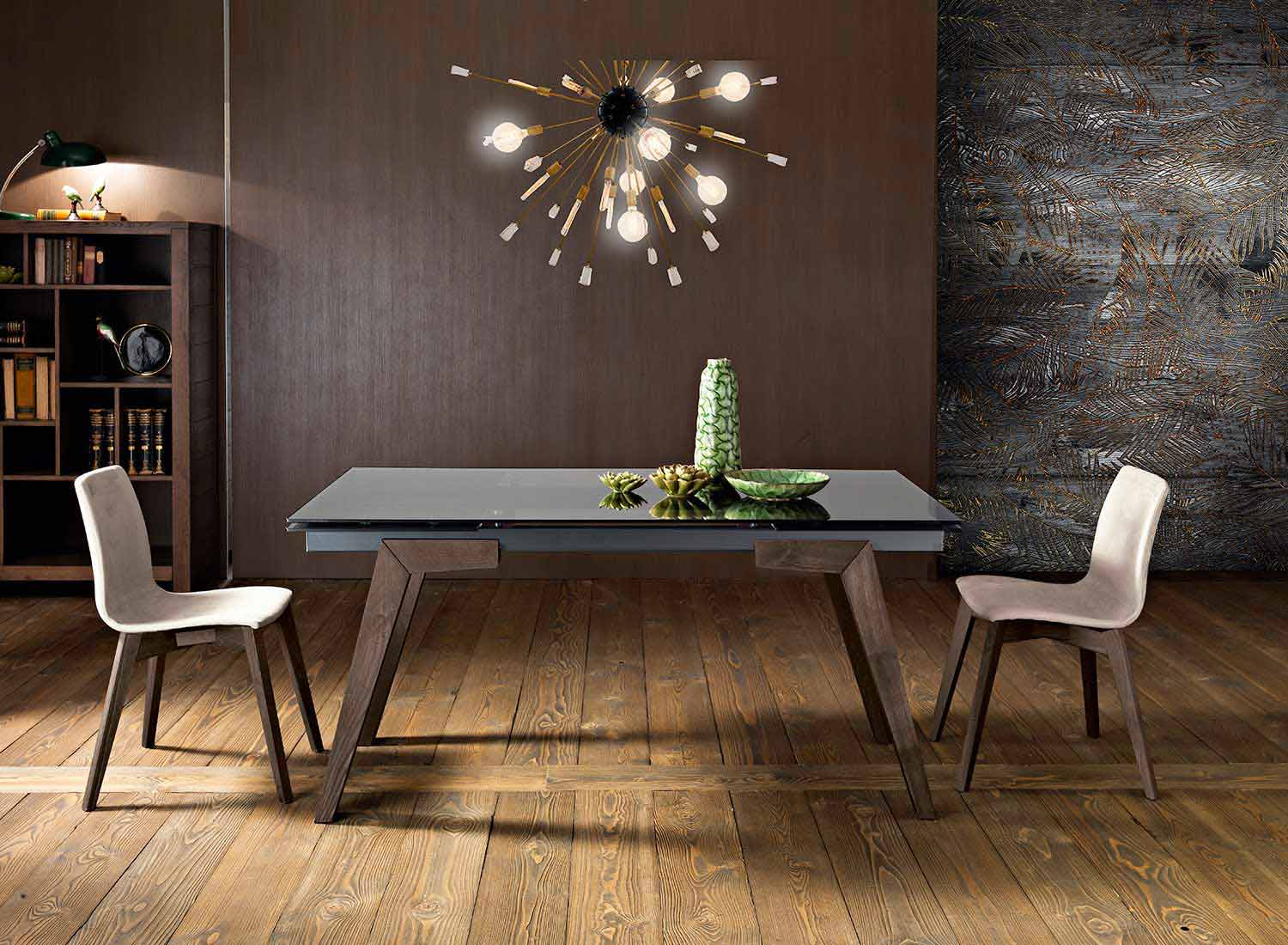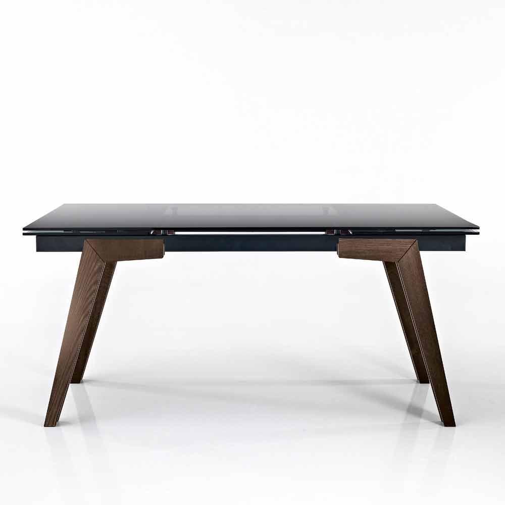 Dimitri est une table à rallonge raffinée fabriquée en Italie avec un plateau en verre trempé fumé de 10 mm d'épaisseur et une base en frêne massif disponible en deux finitions différentes :