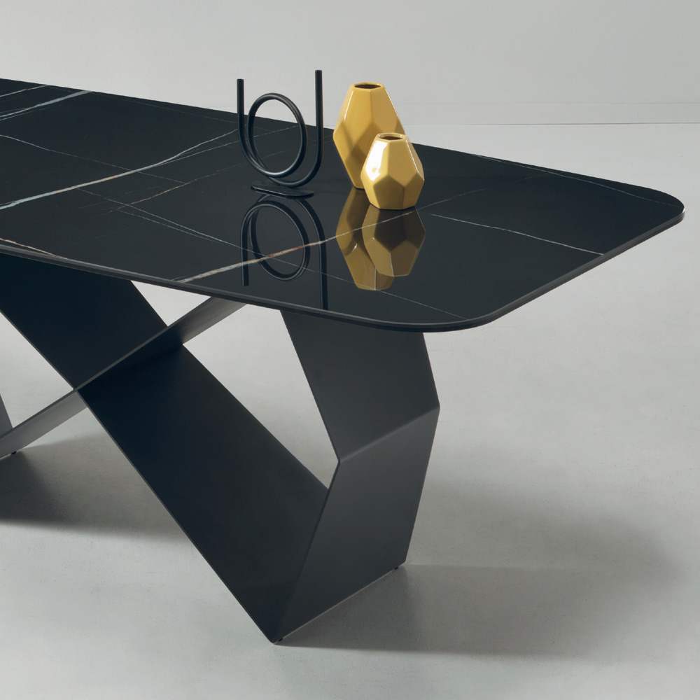 Table à manger entièrement fabriquée en Italie avec plateau en céramique effet marbre et structure en métal peint en noir . Un meuble au goût contemporain caractérisé par des formes géométriques simples qui s'unissent pour créer une harmonie unique dans les salles à manger ou les cuisines modernes. La particularité de cette table est sans aucun doute la conformation originale de la structure qui crée un effet visuel unique capable de conquérir l'environnement avec personnalité, en devenant son véritable protagoniste. L'élégant plateau en céramique effet marbre enrichit encore son esthétique pour un résultat raffiné au caractère créatif et captivant .