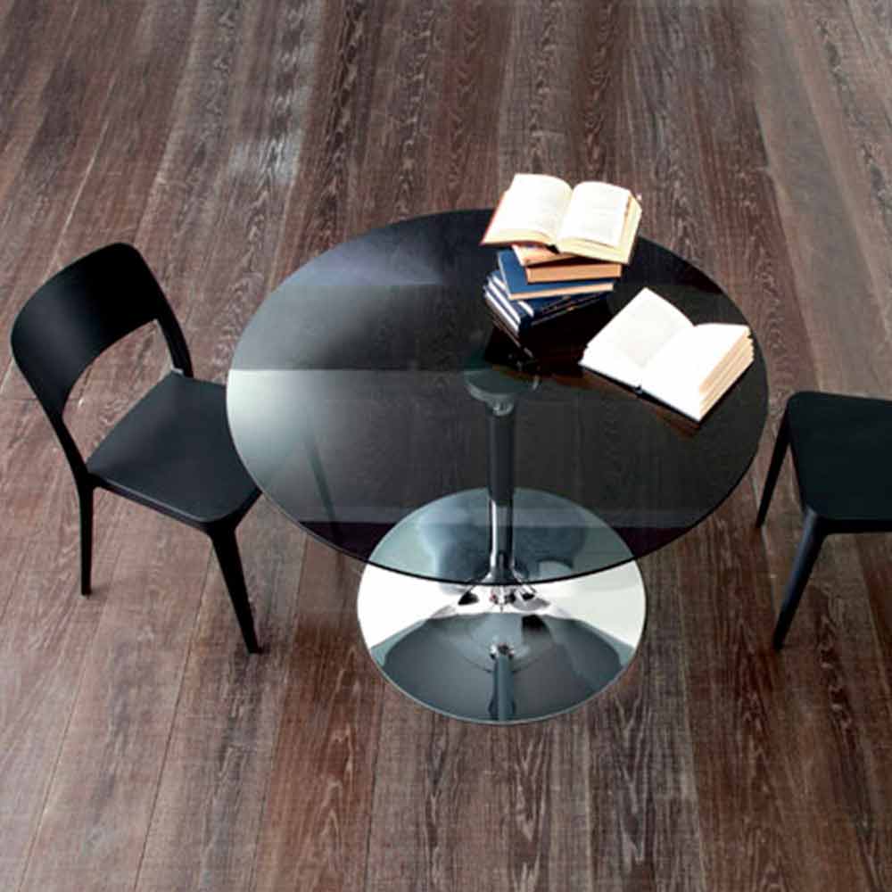 Table à manger fabriquée en Italie avec plateau en verre rond (10 mm d'épaisseur) et base de colonne centrale en métal chromé .