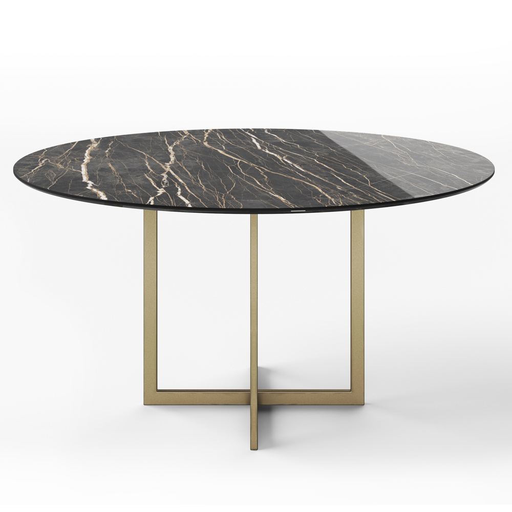 Table de salle à mangeravec plateau rond en grès cérame effet marbre poli soutenu par un verre laqué (8 mm d'épaisseur) avec bord biseauté à 45 ° et structure en métal finition laiton bruni , entièrement fabriqué en Italie . Son esthétique découle des concepts de liberté et de créativité car elle offre la possibilité de choisir parmi une large gamme de finitions différentes capables d'enrichir l'environnement avec personnalité et raffinement. Le design et l'innovation distinguent chaque élément de ce meuble merveilleux et élégant caractérisé par la grande attention aux détails et la haute qualité des matériaux choisis pour sa production.