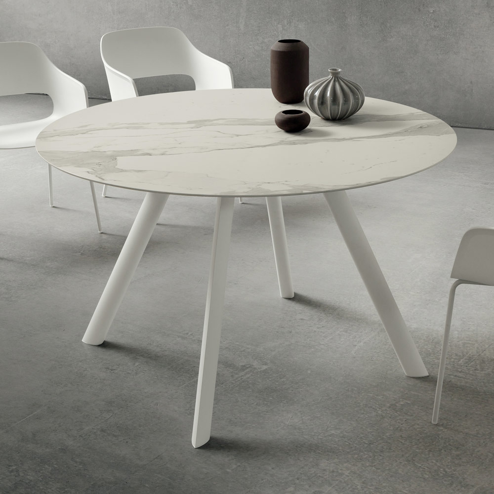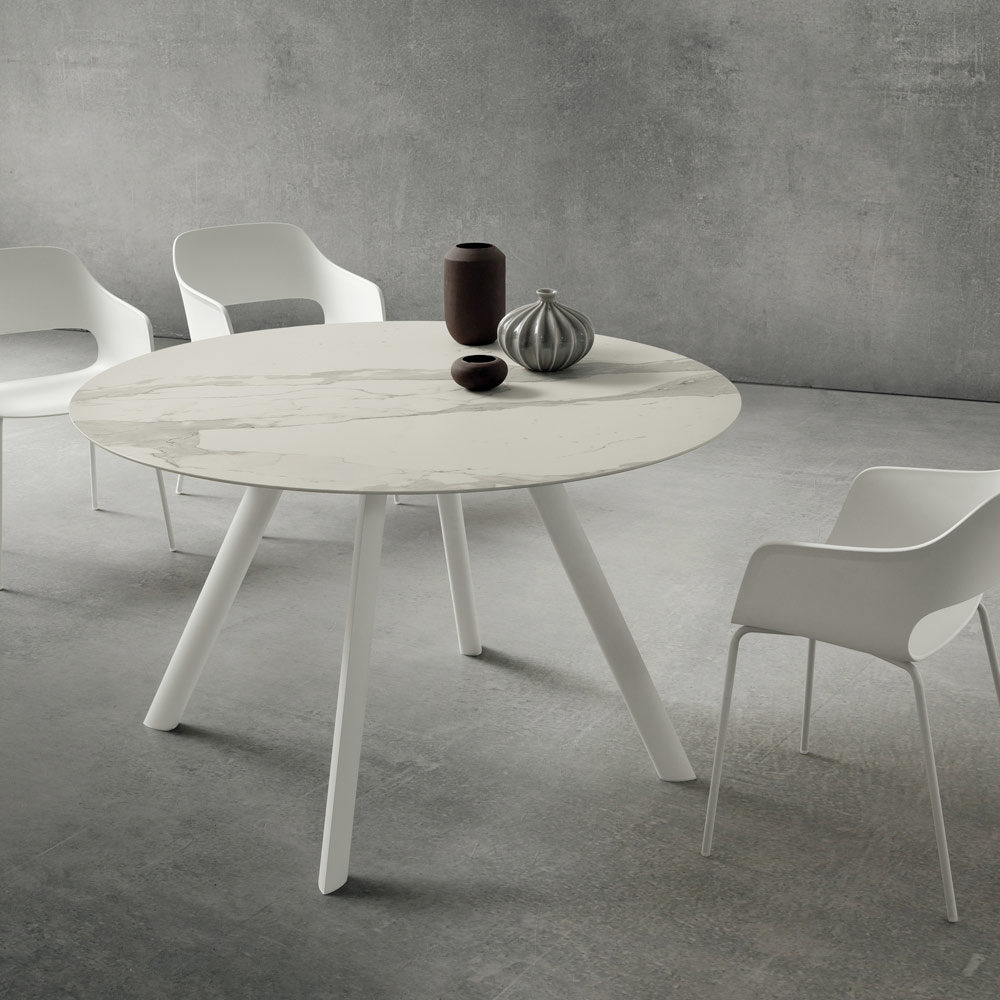 Table à manger de luxe avec plateau rond en céramique laminam Made in Italy.