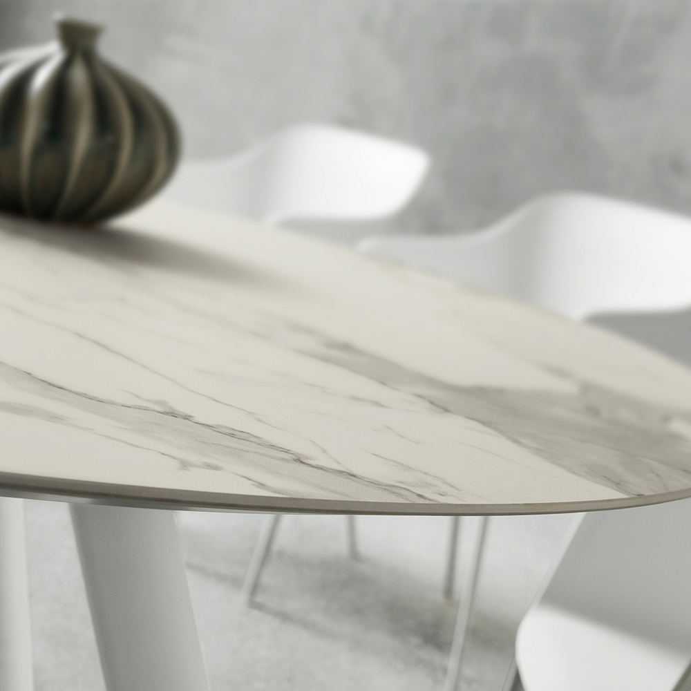 fabrication 100% Made in Italy qui augmente sa valeur et son prestige. Ce qui frappe dans l'esthétique de cette table, c'est le plateau en laminam, une