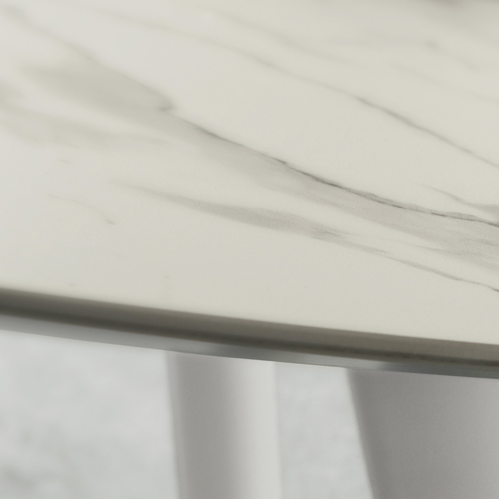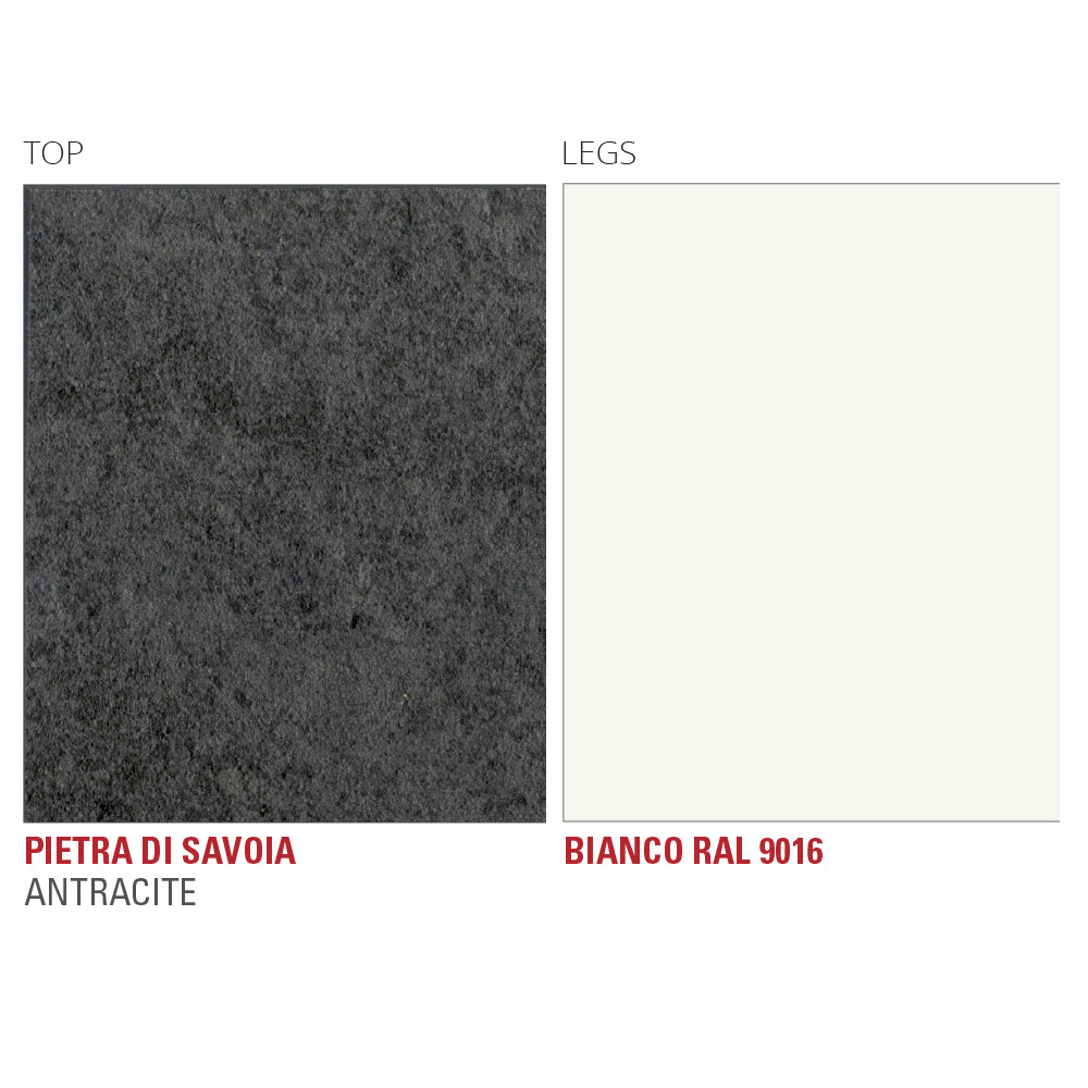 aluminium laqué à la poudre époxy en finition blanche. De la rencontre entre l'élégance intemporelle de l'effet marbre et de l'effet pierre et la touche moderne de l'aluminium, naît un meuble à