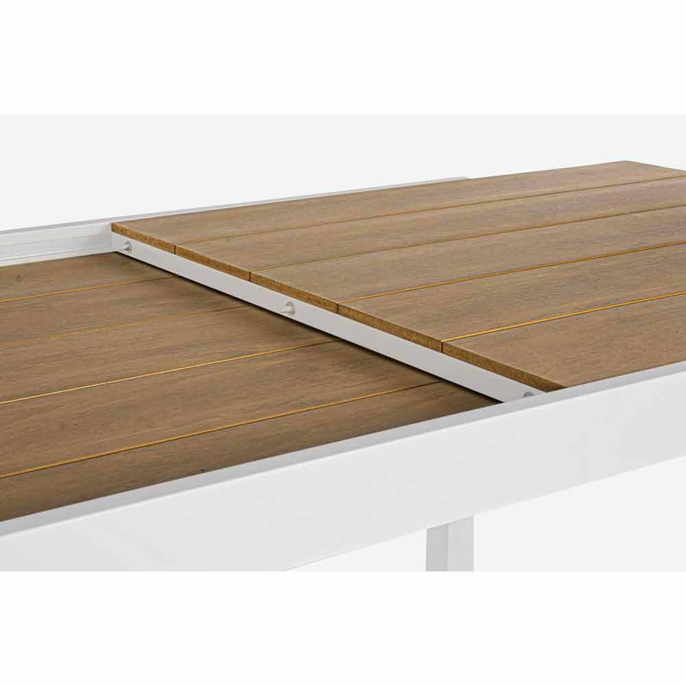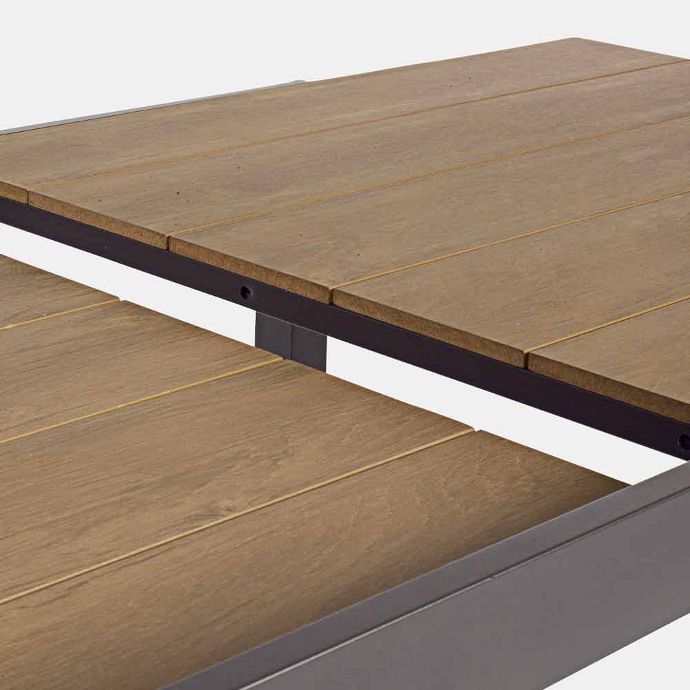 Structure en aluminium enduit de poudre (polyester). Plateau en polywood (matériau composite d'aspect similaire au bois) 90% polystyrène 10% sbs couleur teck. Extension rétractable. Vis en acier galvanisé. Jambes à assembler.