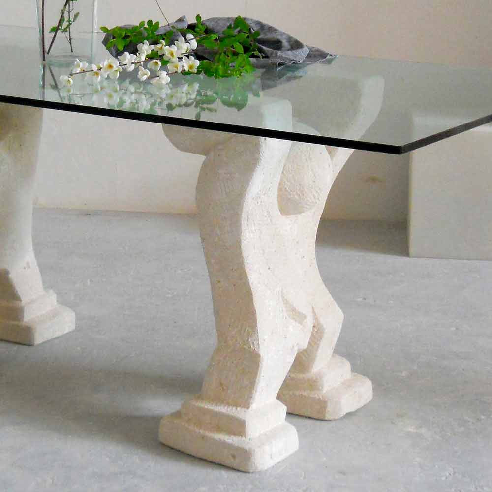 La table Medusa est faite entièrement en Italie. La base est faite en pierre naturelle de Vicenza, qui à été sculptée à la main à partir d'un bloc massif de pierre. Au-dessus de la base il y à un plateau en cristal float de 15 mm d'épaisseue, appuyé à la base.