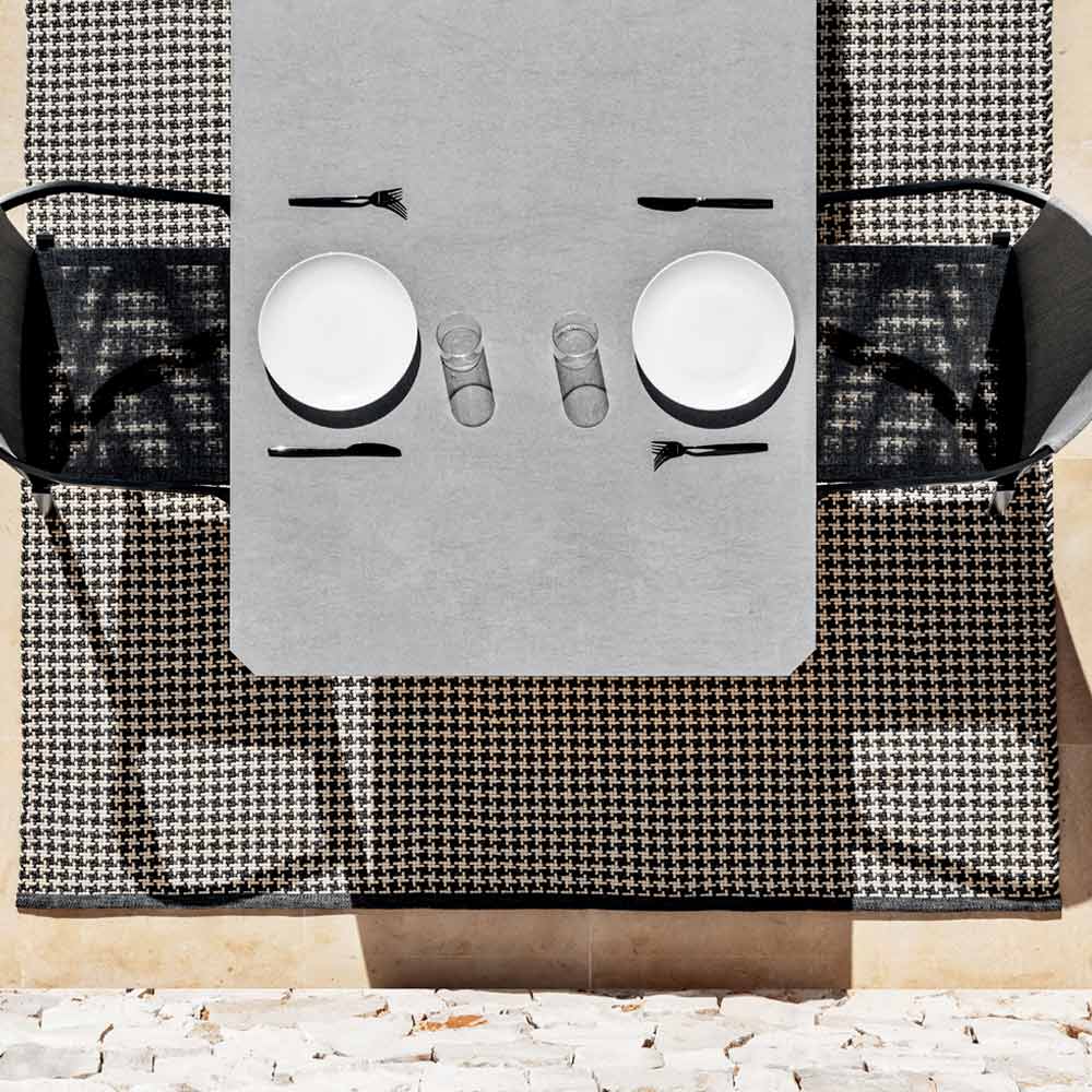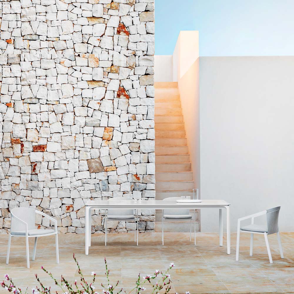 C'est le détail du pied en aluminium moulé qui donne à cette table de jardin le design raffiné qui la distingue et la personnalise dans son calme formel. L'essentialité raffinée des lignes et des volumes est combinée avec le caractère concret des matériaux, pour un effet visuel élégant et constructivement solide qui valorise à la fois l'environnement interne et externe.