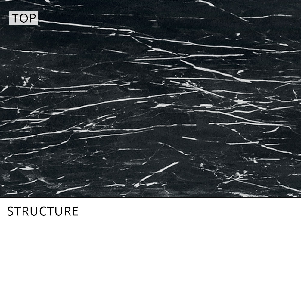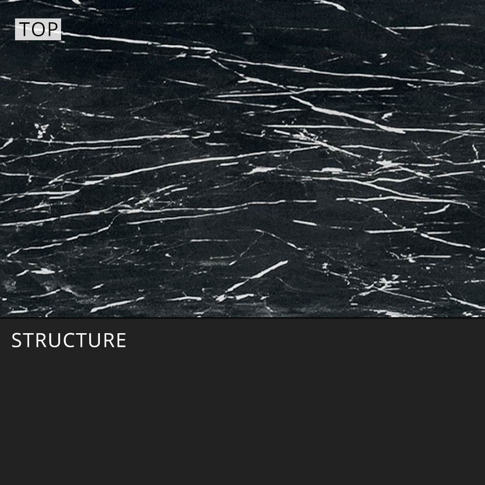 structure en aluminium blanc et plateau en grès cérame effet marbre noir