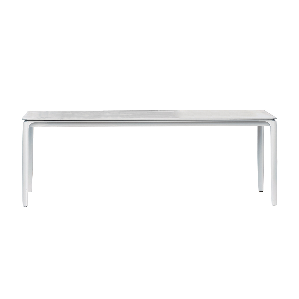 structure en aluminium blanc et plateau en grès cérame effet marbre blanc