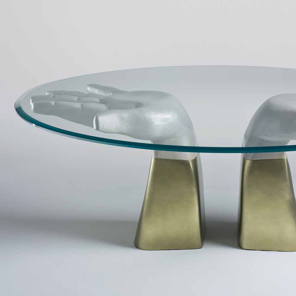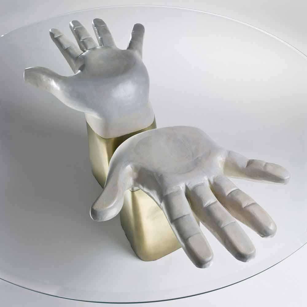 La structure et l'ornement se prônent l'un l'autre: en effet le dessus rond est soutenu par les paumes de deux mains, énormes bras en bois sculptés à main avec les poignets dorés qui rappelle à la memoire suggestions pop. Le dessus est réalisé en verre émoussé.